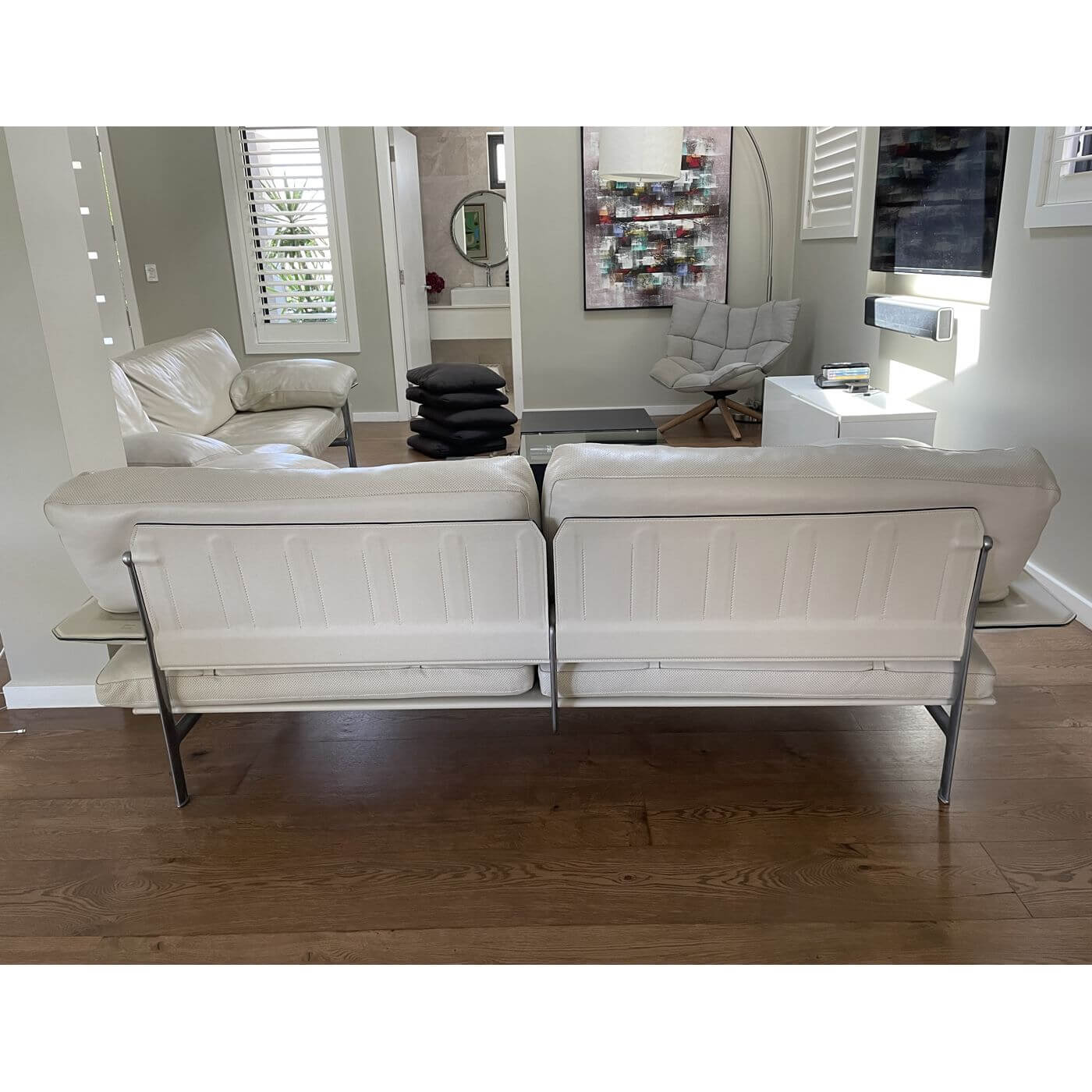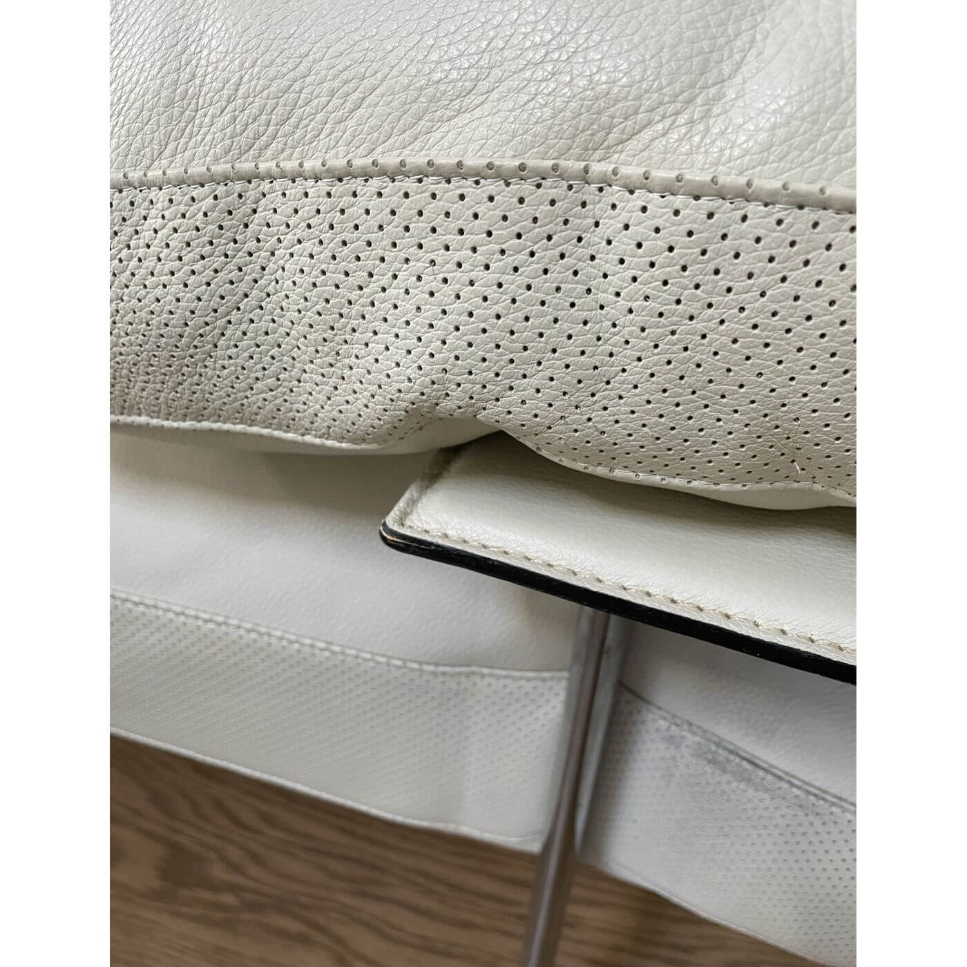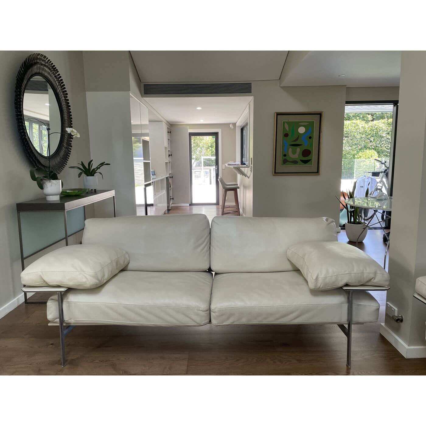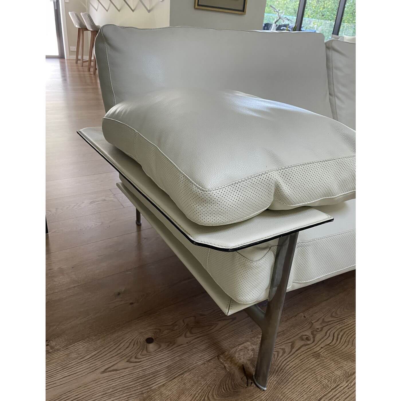 B&B Italia Diesis Sofa. Stunning ivory leather 2 seater sofa, approximately 20 years old and in mint condition. Designed in the late 1970's by Antonio Citterio and Paolo Nava, the Diesis has a beautifully retro personality. Described as 'an absolute icon' it holds an important place in the history of design and is coveted internationally. It's all in the details with the Diesis - the thick leather clad comb-shaped back, the micro-perforated details for aeration, and the leather clad armrests, all topped with plush cushioning. The Diesis is designed with careful attention to detail and has a strong design personality. It is stunning from any angle and with its leather upholstered back can be placed at the centre of the room.