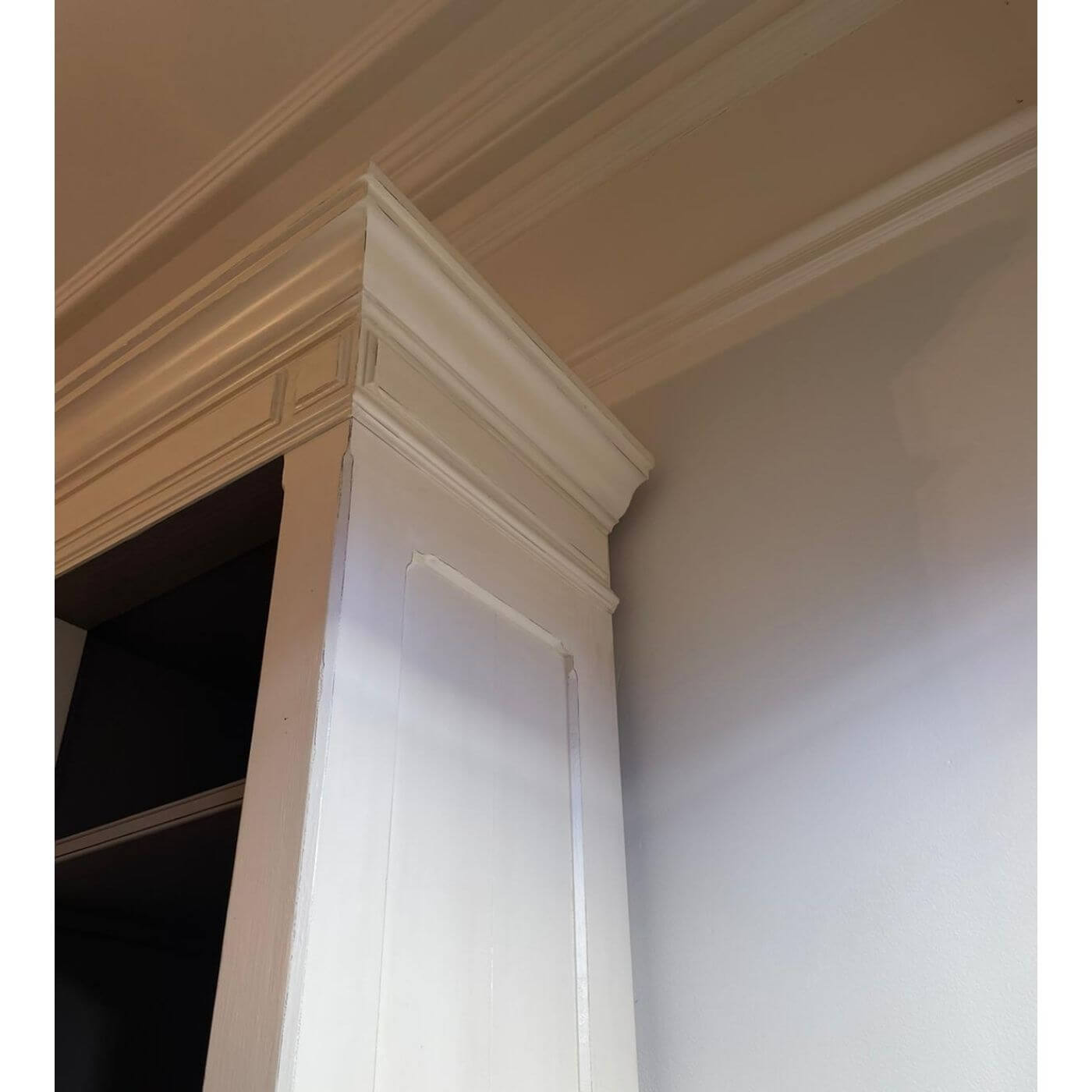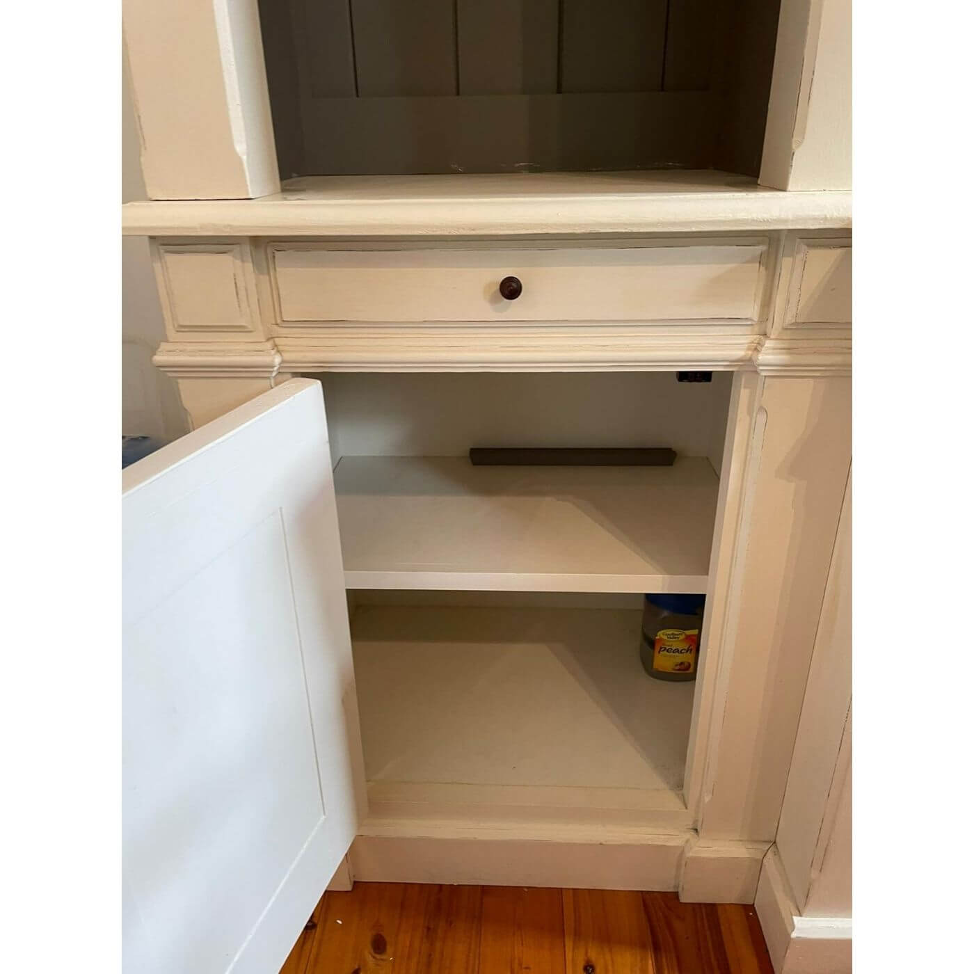Camargue Mosman custom made Display Unit. Established 1996, Camargue specialises in antique furniture, decorative items and high quality homewares, both custom made and imported from Europe. This beautifully crafted display cabinet is ideal for an eat in kitchen or dining room, or a living room space as a bookshelf. Display shelving area painted grey. Exterior and base unit in antique white. French provincial aesthetic with softened edges. Disassembles into 3 pieces for ease of transport. Reassembly & installation not included in delivery. Made for rooms with high ceilings! Originally custom made for $9,000.