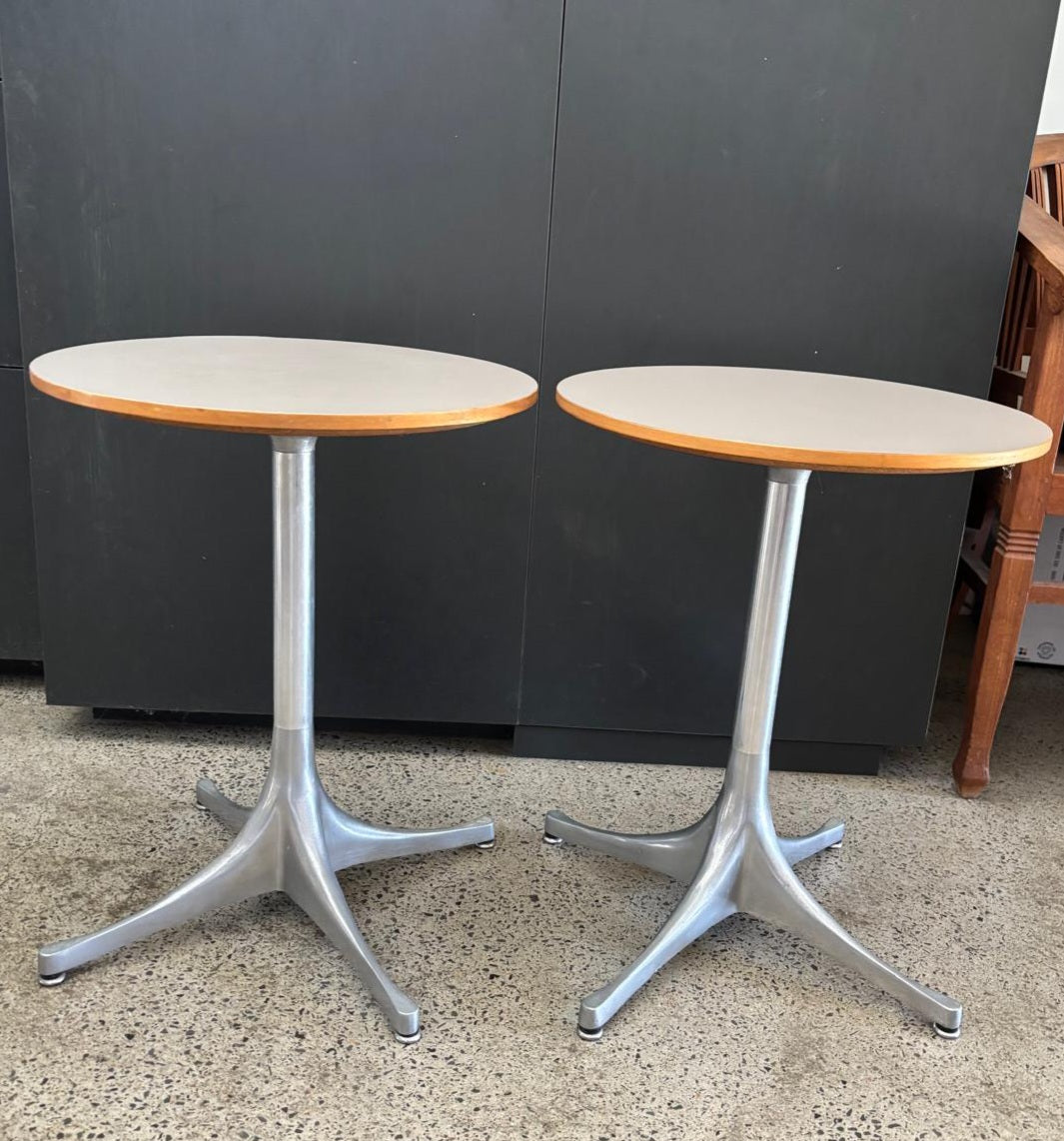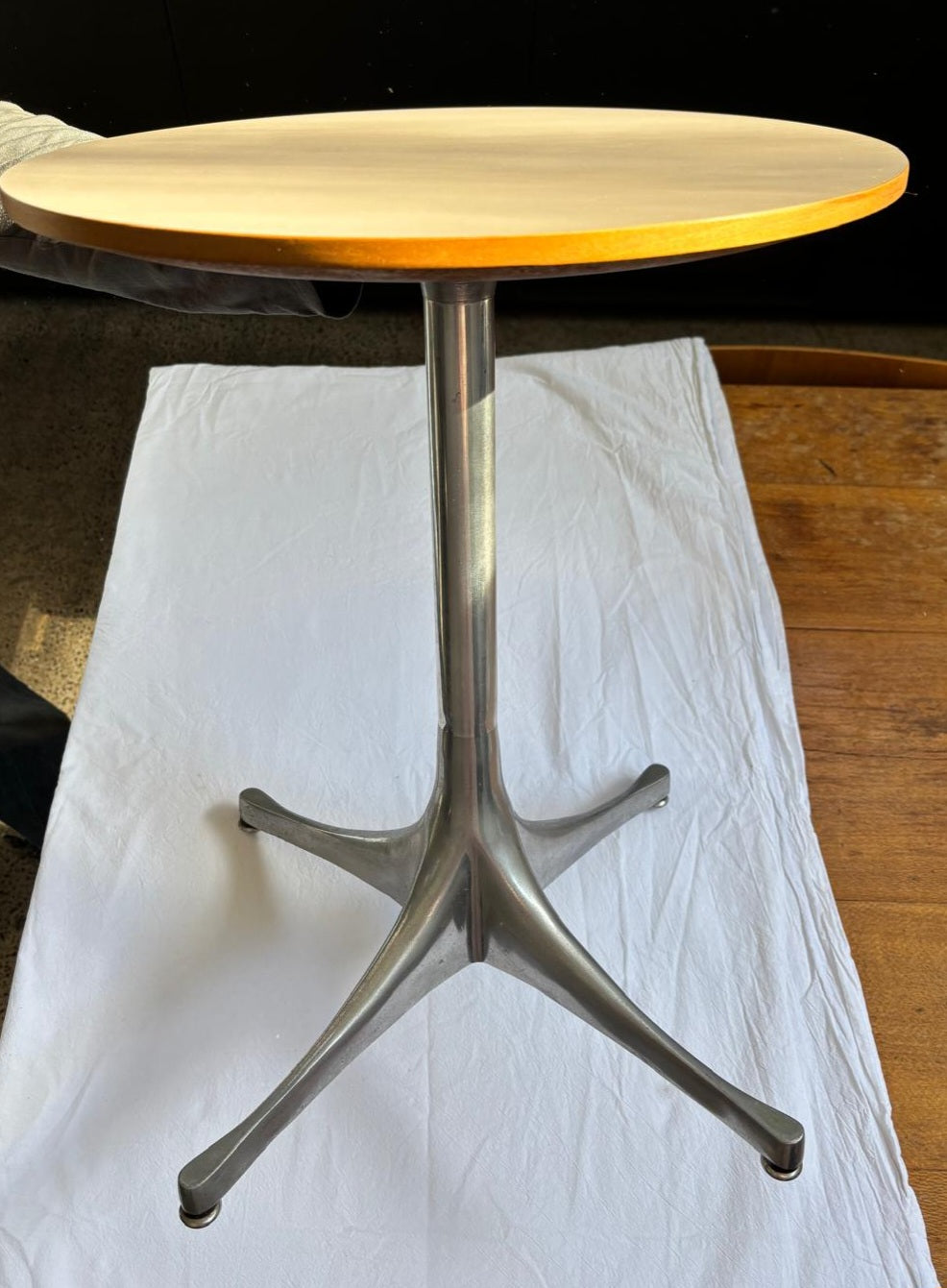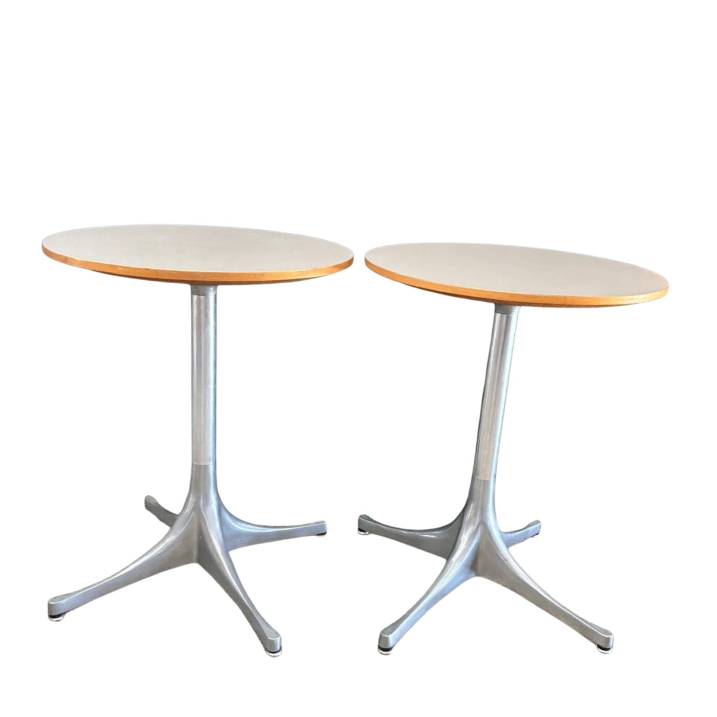 Herman Miller Nelson Pedestal side tables. A pair of round side tables, Herman Miller classics, designed by George Nelson in 1954. Laminate tops in mid grey (taupe), maple veneered edge, pedestal and legs in brushed aluminium. The clean & graceful lines of the pedestal and legs are typical of a Nelson design. 1 sidetable in excellent used condition, other in good used condition (small nick and minor scratches noted in photo). Selling as a pair.