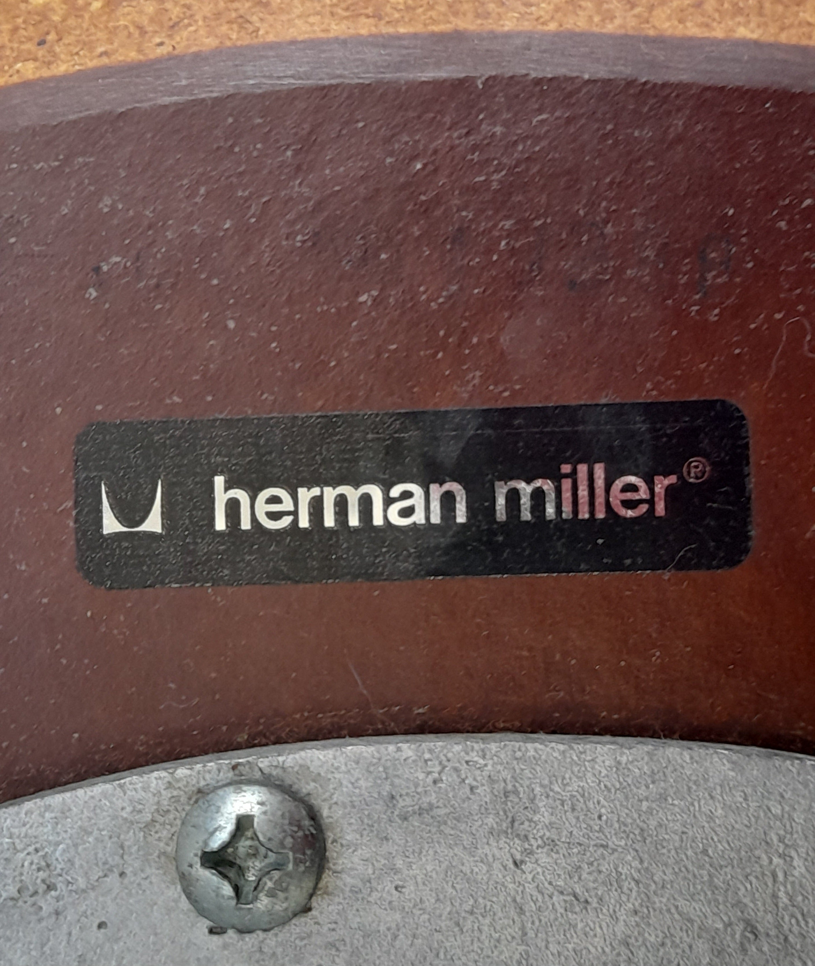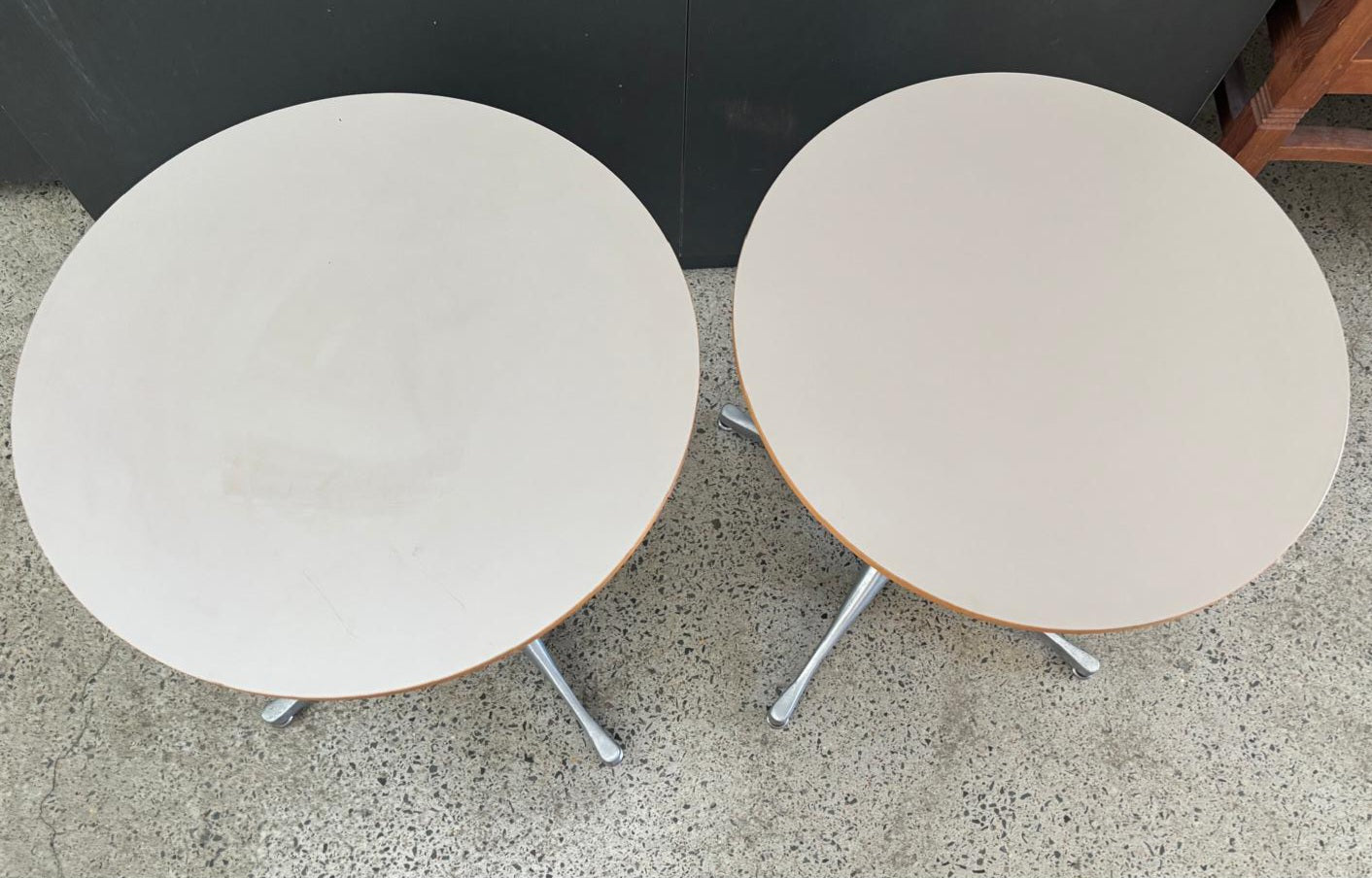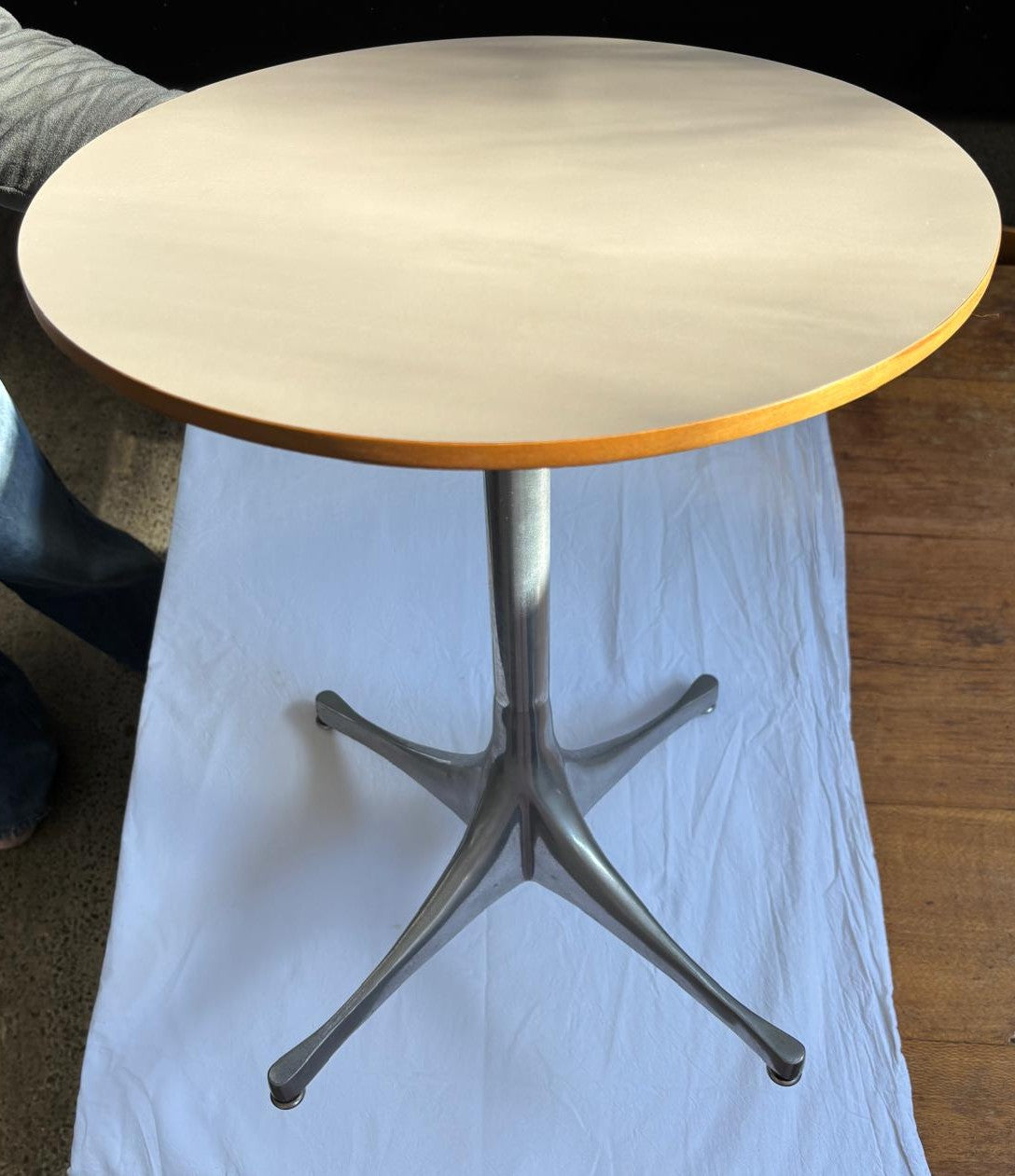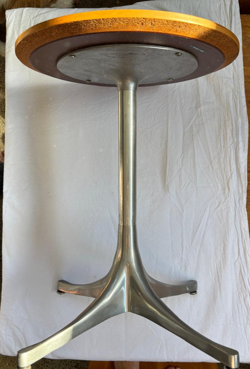 Herman Miller Nelson Pedestal side tables. A pair of round side tables, Herman Miller classics, designed by George Nelson in 1954. Laminate tops in mid grey (taupe), maple veneered edge, pedestal and legs in brushed aluminium. The clean & graceful lines of the pedestal and legs are typical of a Nelson design. 1 sidetable in excellent used condition, other in good used condition (small nick and minor scratches noted in photo). Selling as a pair.