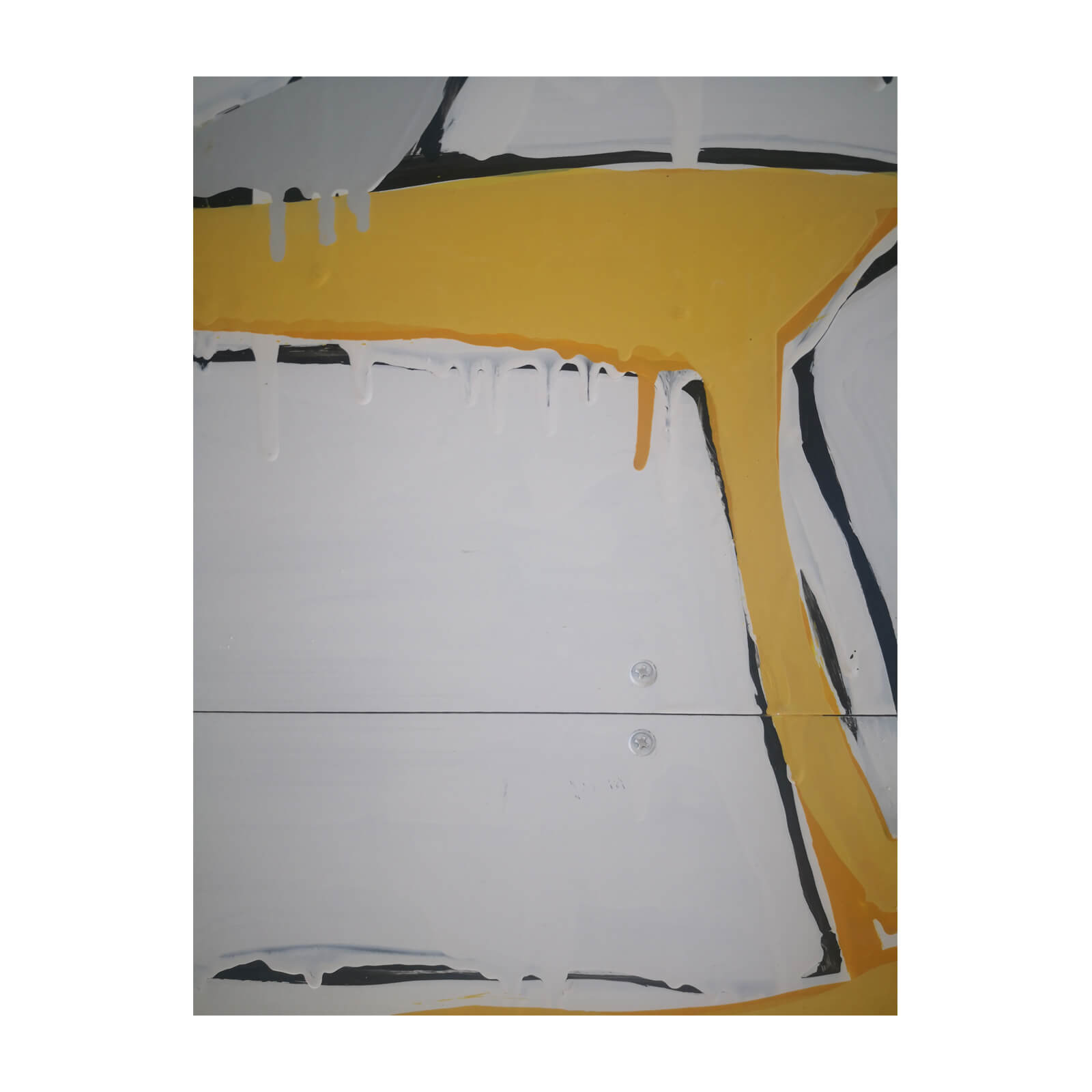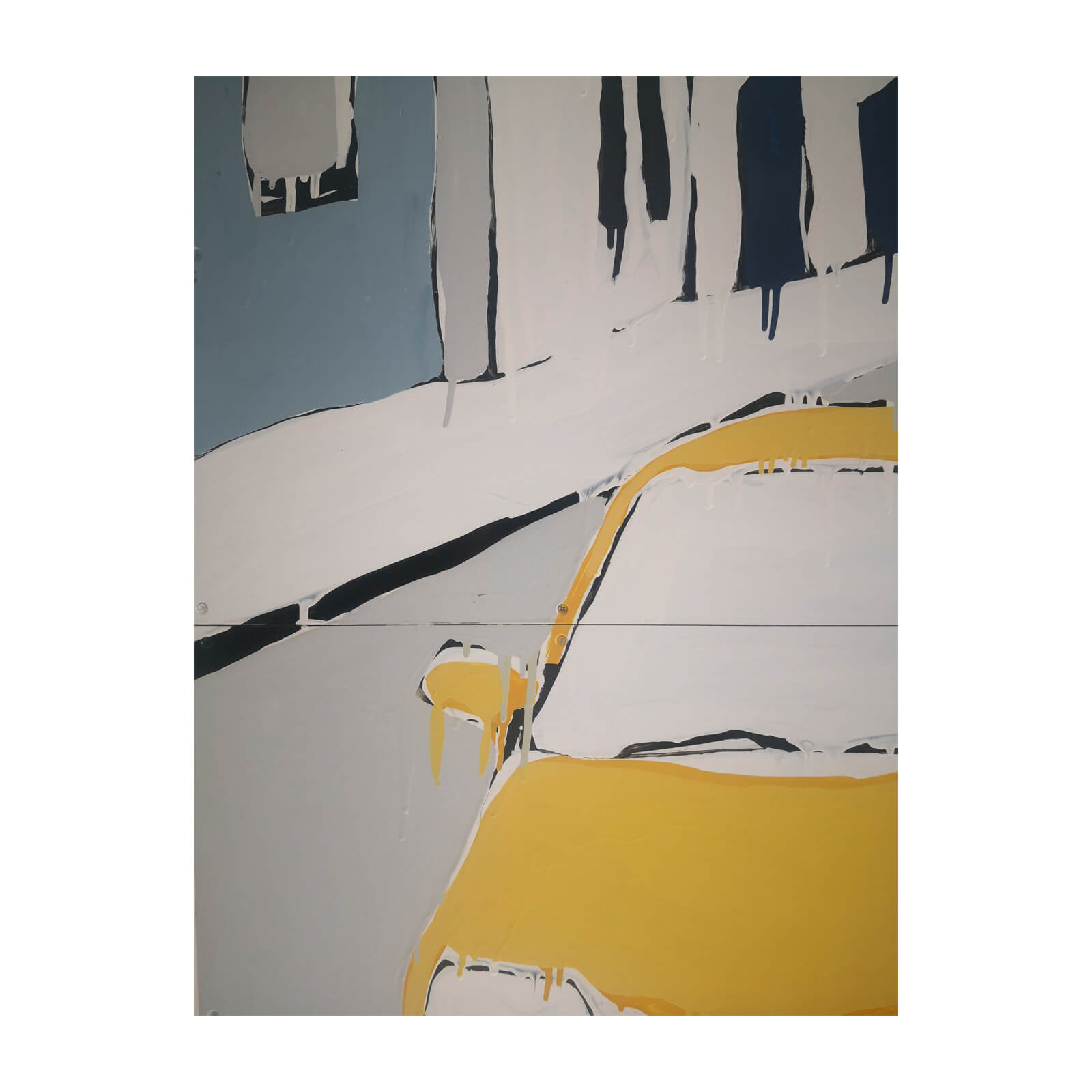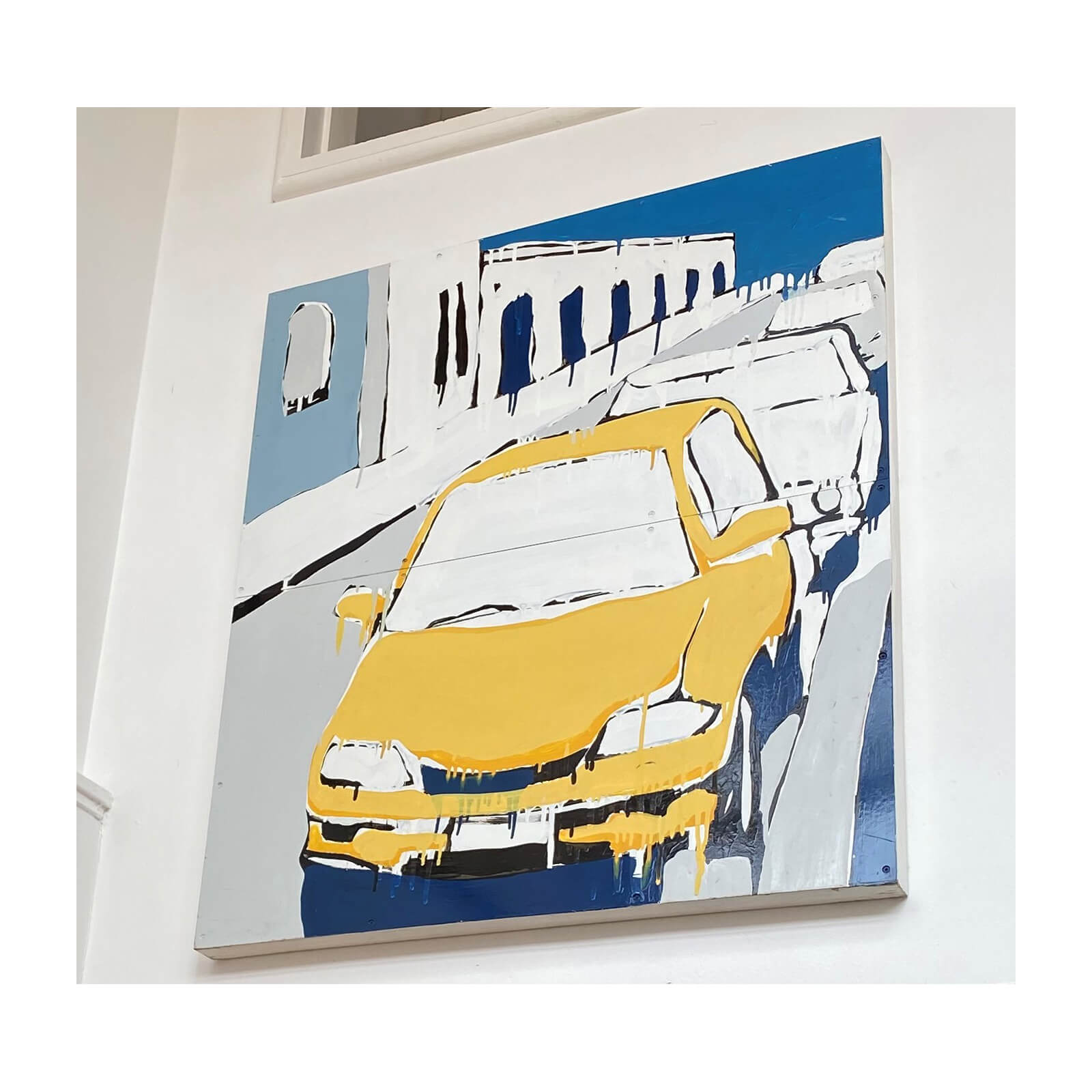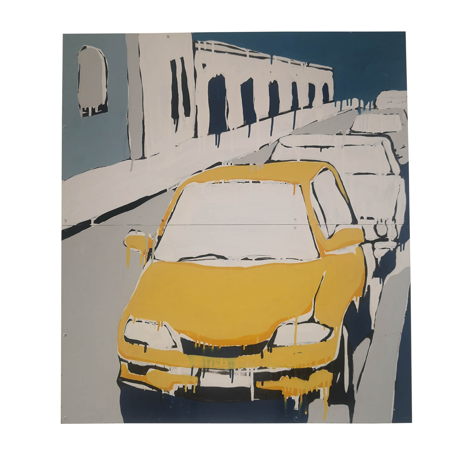 Jasper Knight 'All Day Every Day 2005' synthetic polymer painting on board. Signed lower verso. Titled Verso Yellow car. Iain Dawson Gallery in Paddington. Gallery tag on back $11k.