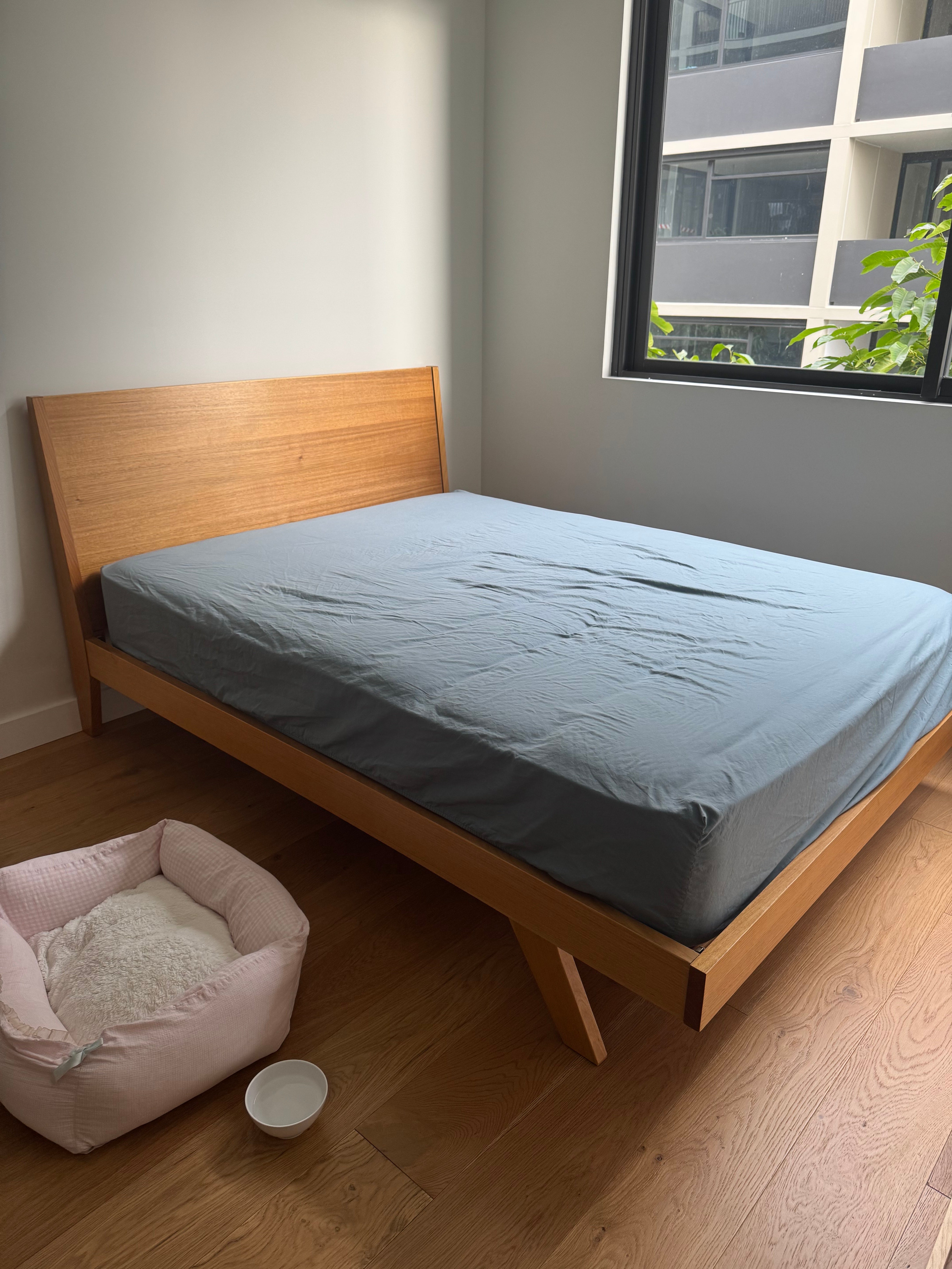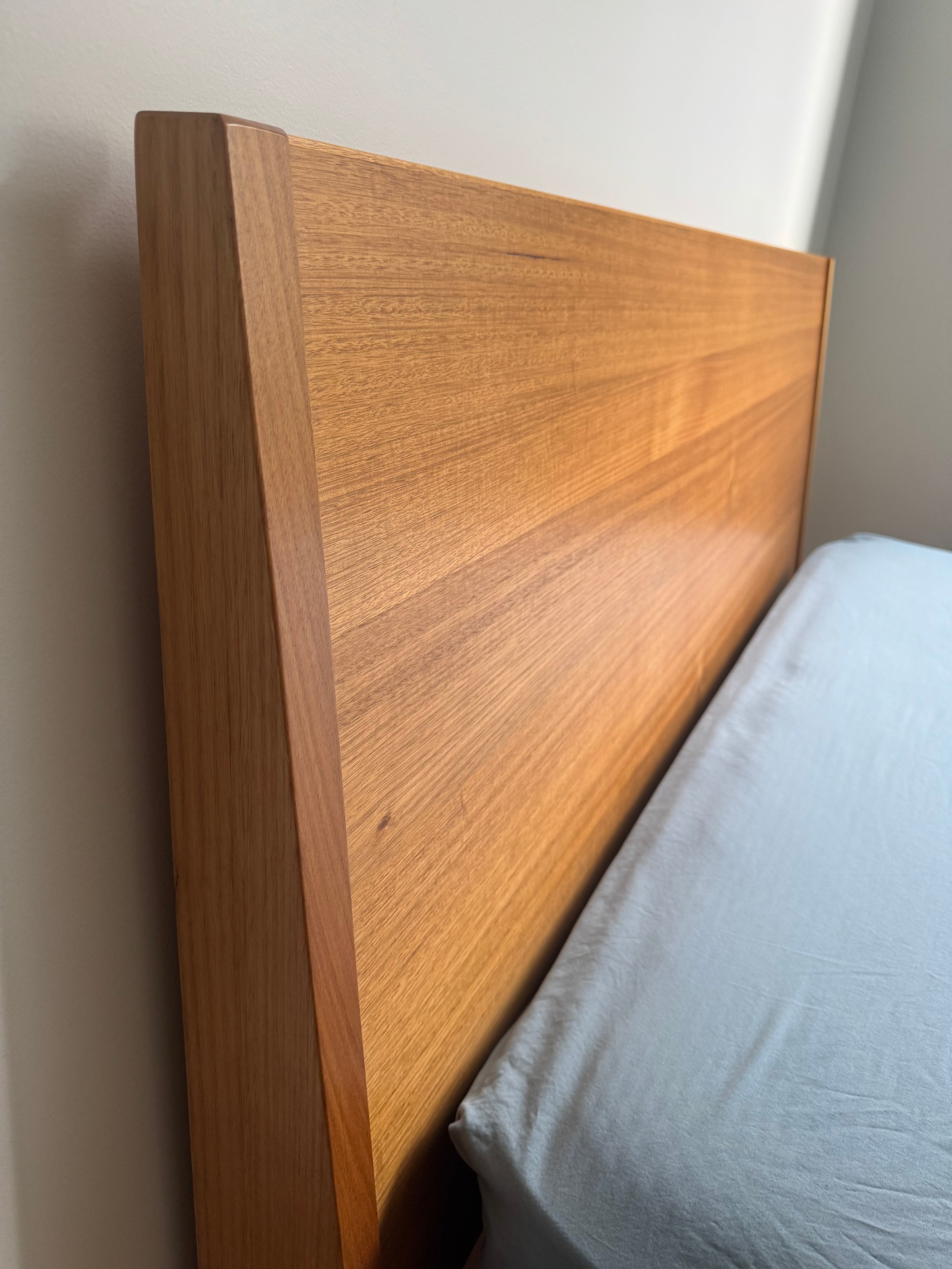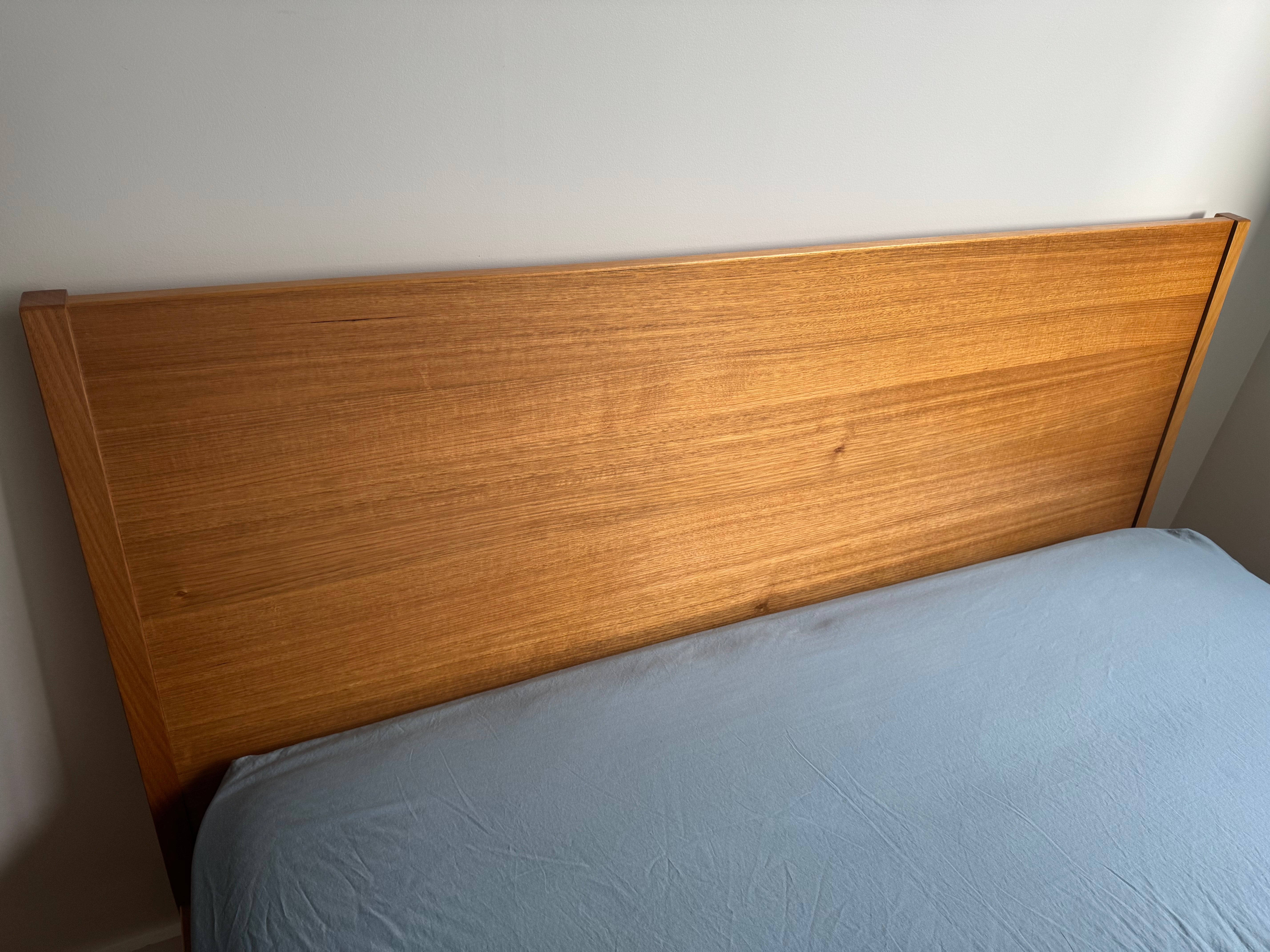 Mark Tuckey Queen Bed Frame. Solid timber headboard with slight angle, front leg detail, and slim frame edge . A simple and elegant timber bedframe that will stand the test of time. Mattress can be included in the price. Headboard H 105cm height, W 160cm. The Mattress is 26cm height. The total bed height from floor including mattress is 56cm. Originally purchased in 2019. Will be disassembled for delivery. Reassembly not included in price but can be requested.