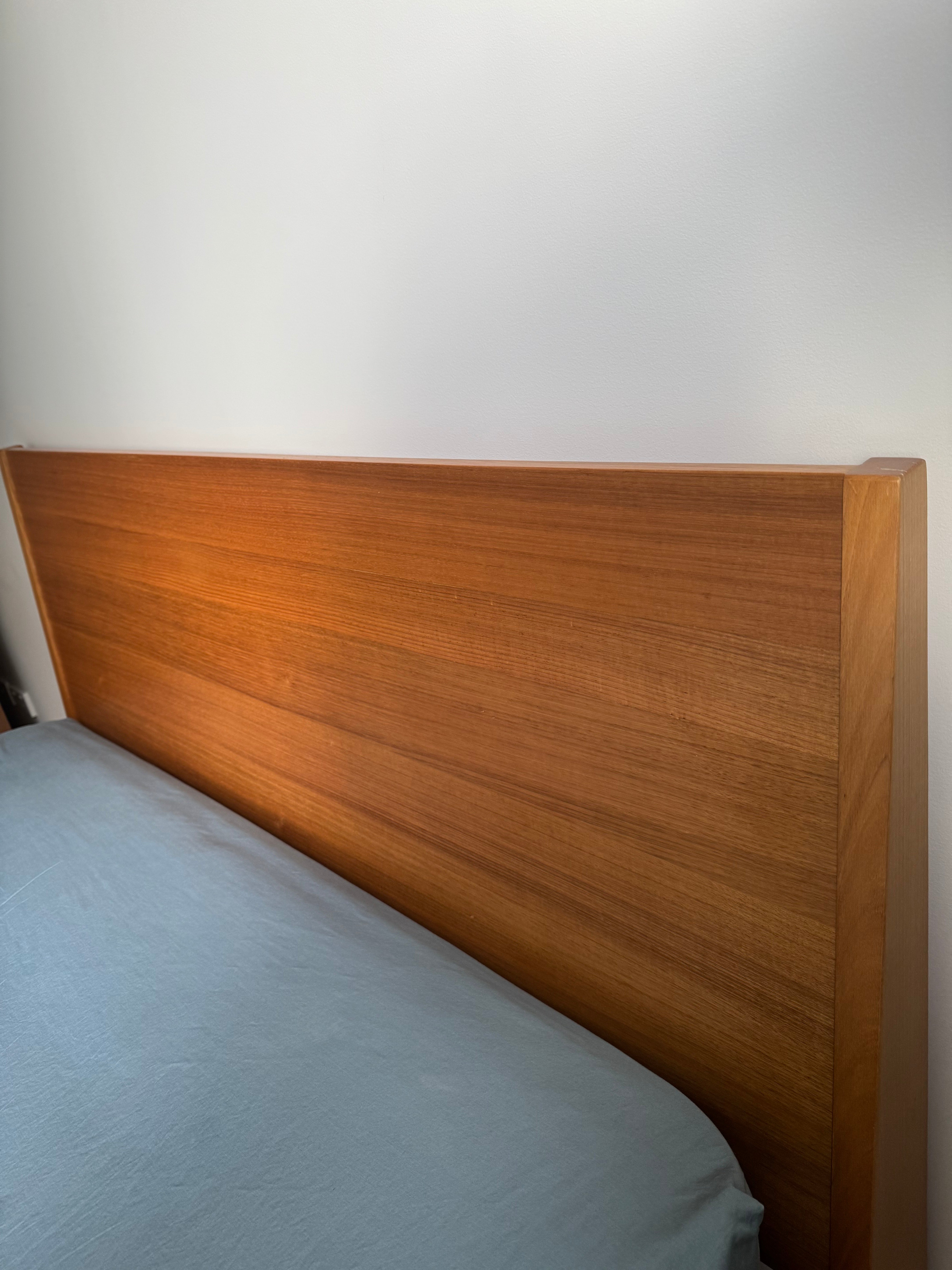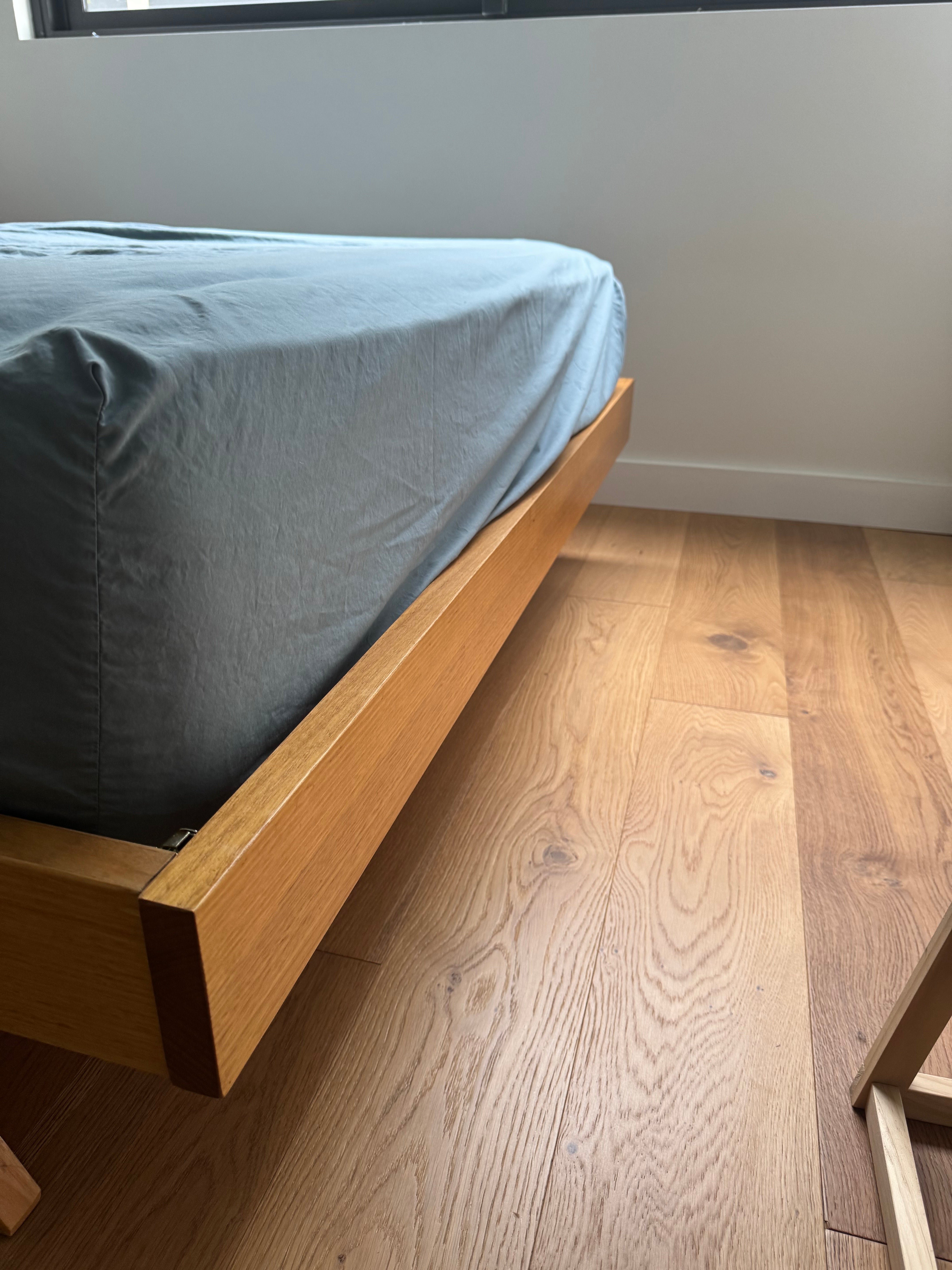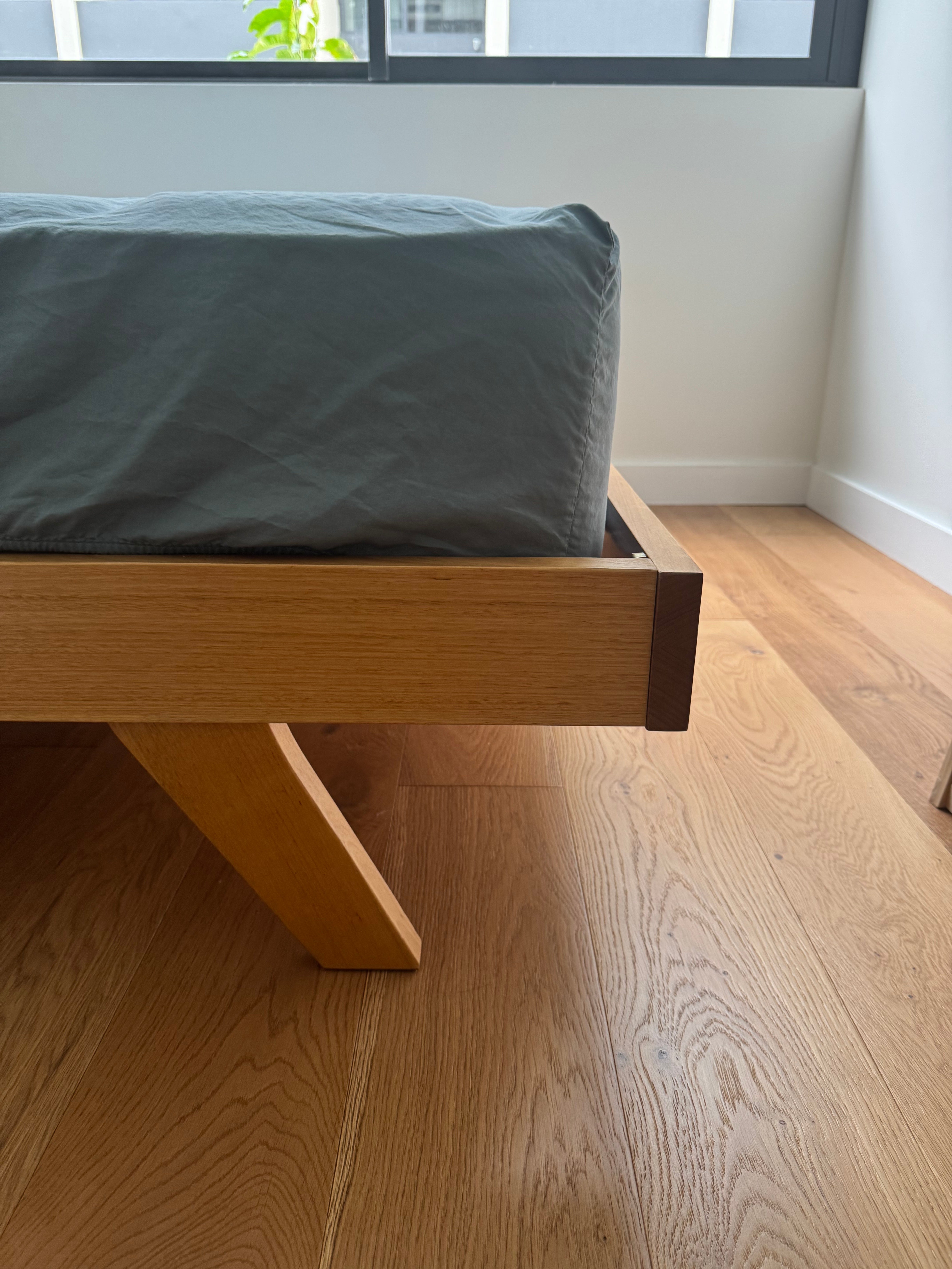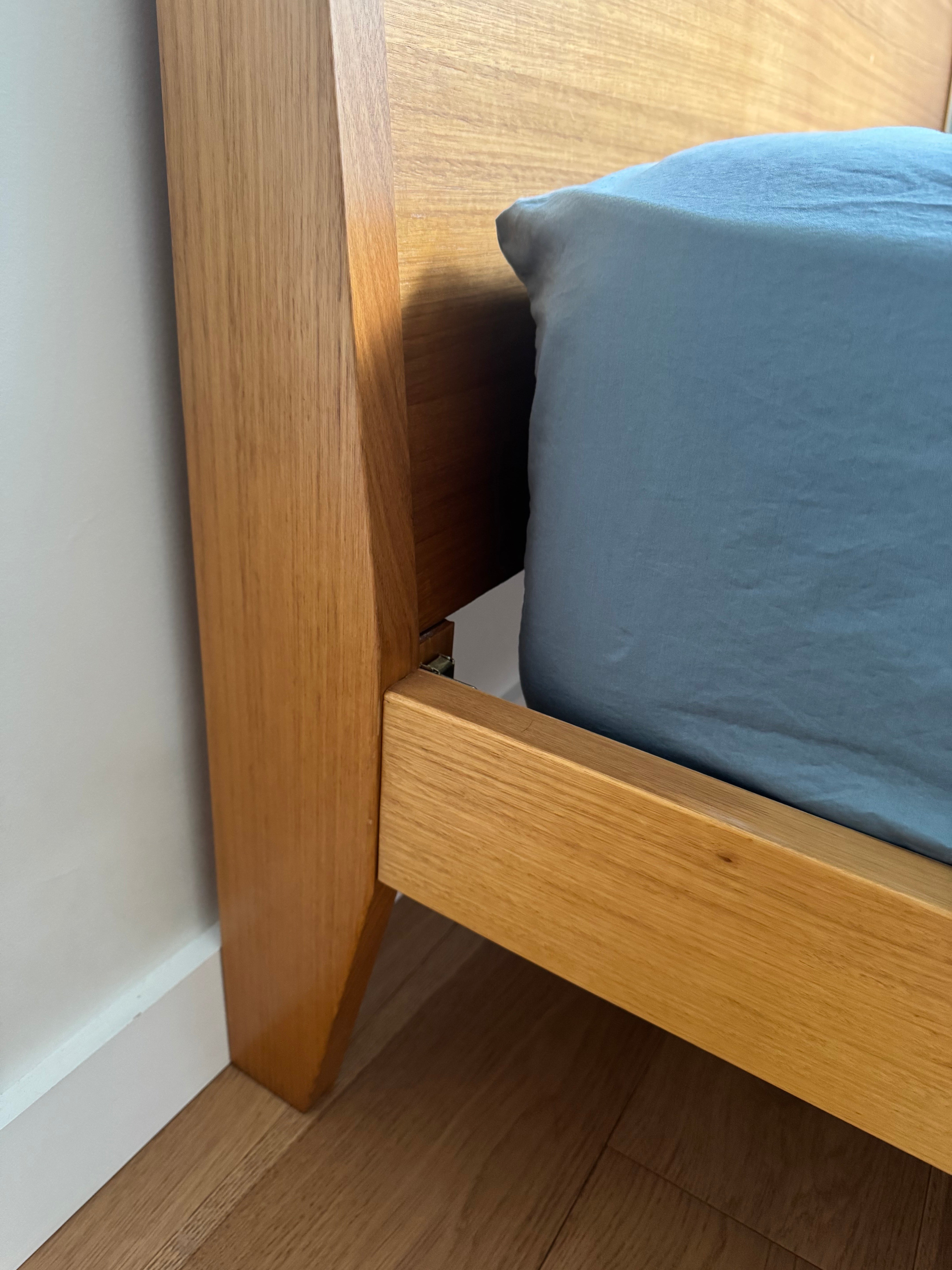 Mark Tuckey Queen Bed Frame. Solid timber headboard with slight angle, front leg detail, and slim frame edge . A simple and elegant timber bedframe that will stand the test of time. Mattress can be included in the price. Headboard H 105cm height, W 160cm. The Mattress is 26cm height. The total bed height from floor including mattress is 56cm. Originally purchased in 2019. Will be disassembled for delivery. Reassembly not included in price but can be requested.