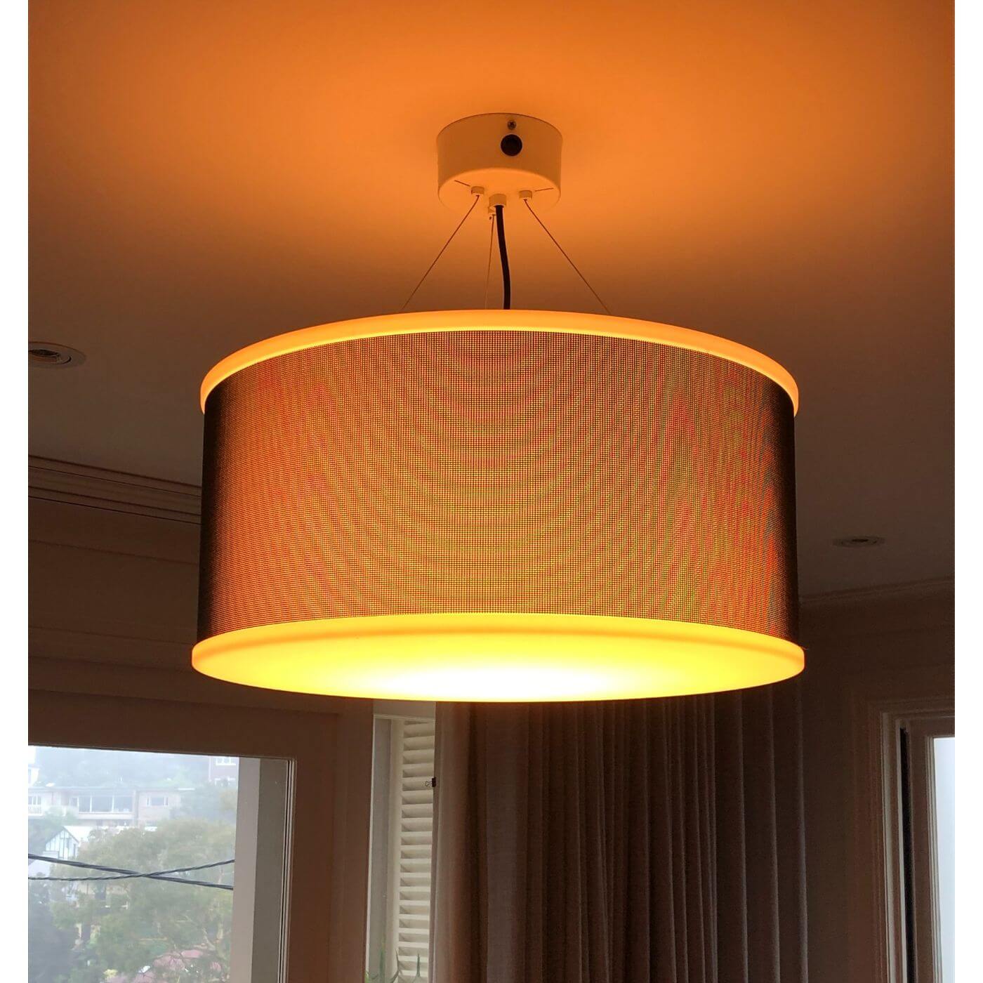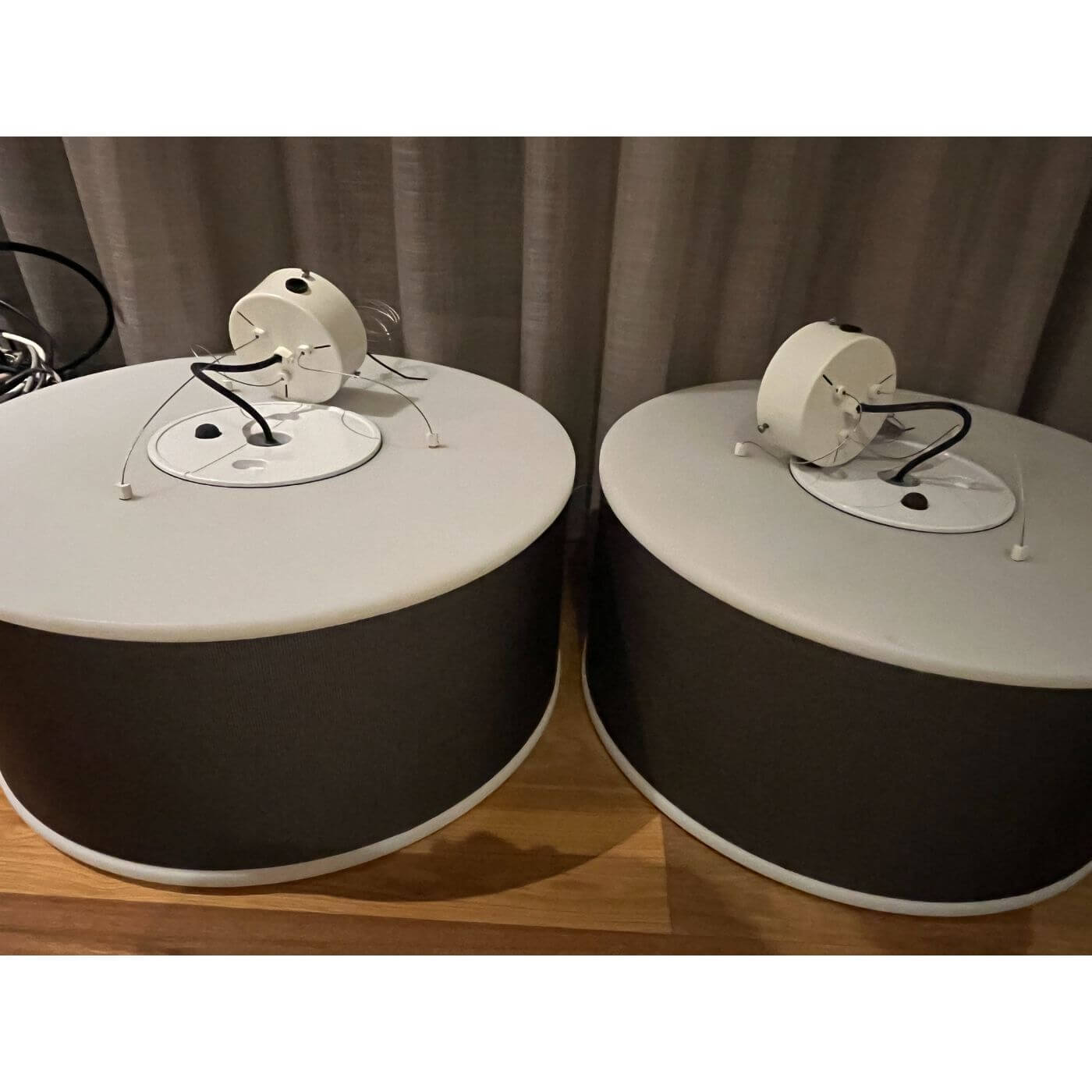 Two beautiful European styled pendant lights that provide a warm, comfortable indoor atmosphere. Manufactured by Marset and designed by Joan Gaspar, the 'Cala' pendant light is a modern, contemporary light made from a rotary moulded polyethylene shade that is enclosed in a zipped textilene sleeve. These lights were installed indoors however can also be installed in an outdoor setting. There are two available with pricing reduced to $600 for a single or $1,000 for the pair.