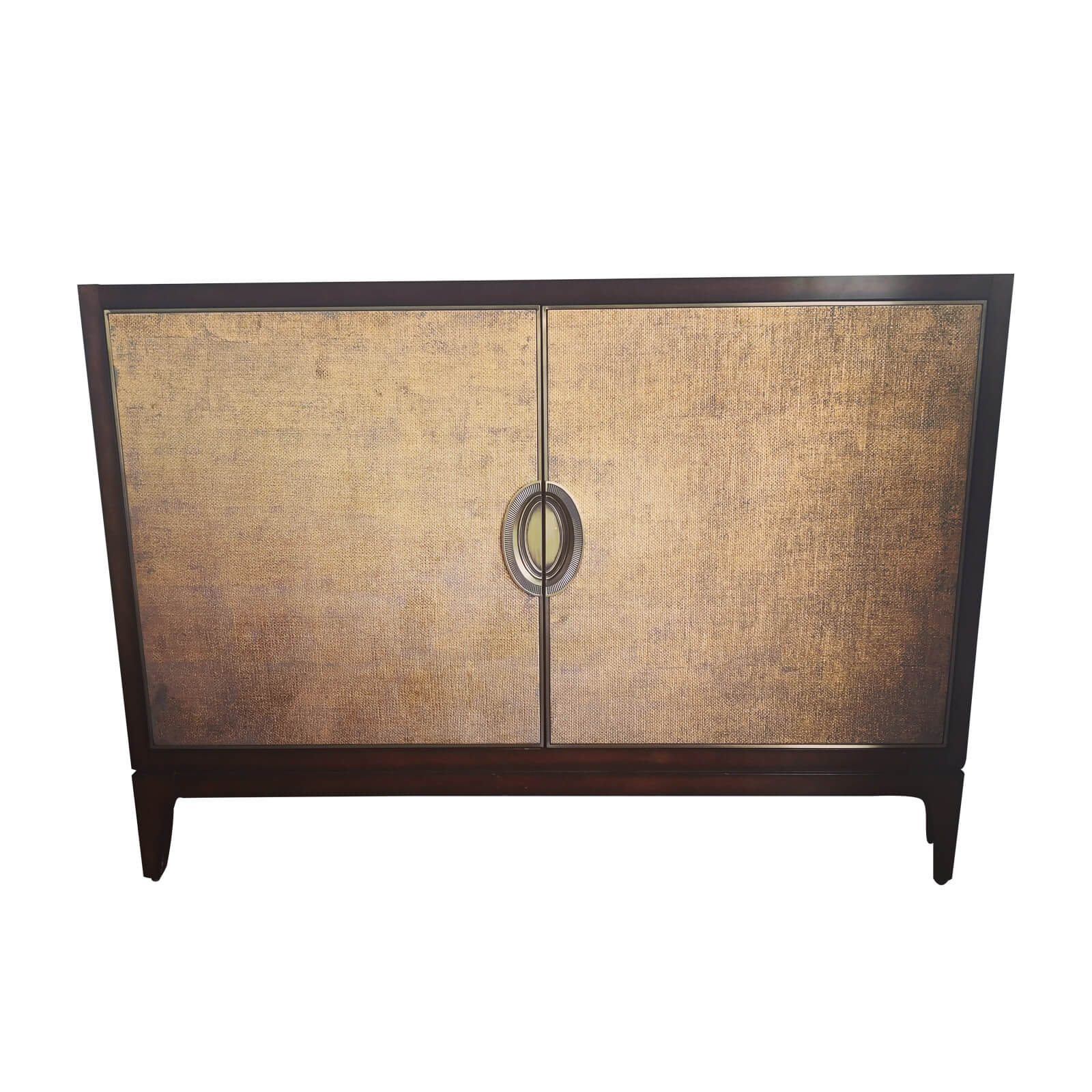 Max Sparrow bar cabinet. With distressed gold hued rattan doors, a composite stone top and wood body, this is a fabulous bar or sideboard for entertaining. Behind the gorgeously decorative doors are a series of compartments and drawers, hooks, bottle storage and a serving tray. A beautiful piece of furniture that is also very functional. Originally purchased for around $7000.