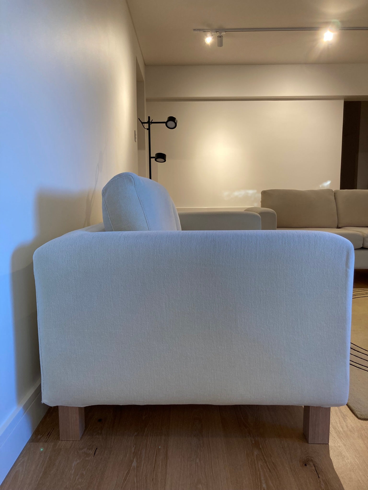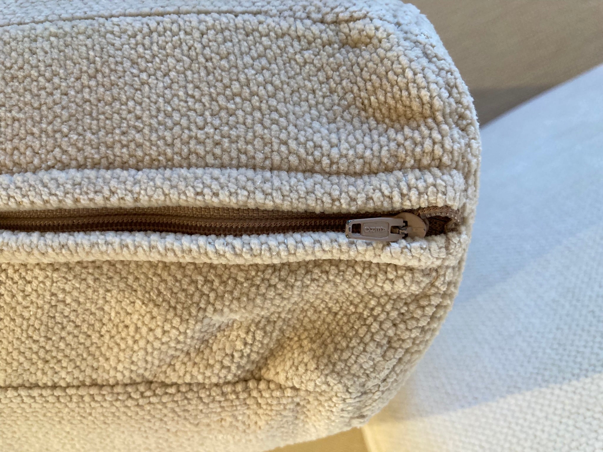 Fanuli Australian made sofas are handcrafted to last a lifetime and designed to suit a relaxed way of life. These "Nomad" sofas exhibit a contemporary streamlined style, are very comfortable, and in great condition. Frame in solid hardwood. Recently refurbished legs in solid Tasmanian oak. Premium quality enduro foam filling. Upholstered in Warwick "Campbell" - a tactile, cotton-rich chenille fabric (67% Cotton, 33 % Polyester) in colour "Oyster" - a neutral cream. All the cushions, seat and back, are reversible. The entire cover is fully removable - Velcro attached to the frame underside- as are the cushion covers - which are zipped. All machine washable for easy care.
