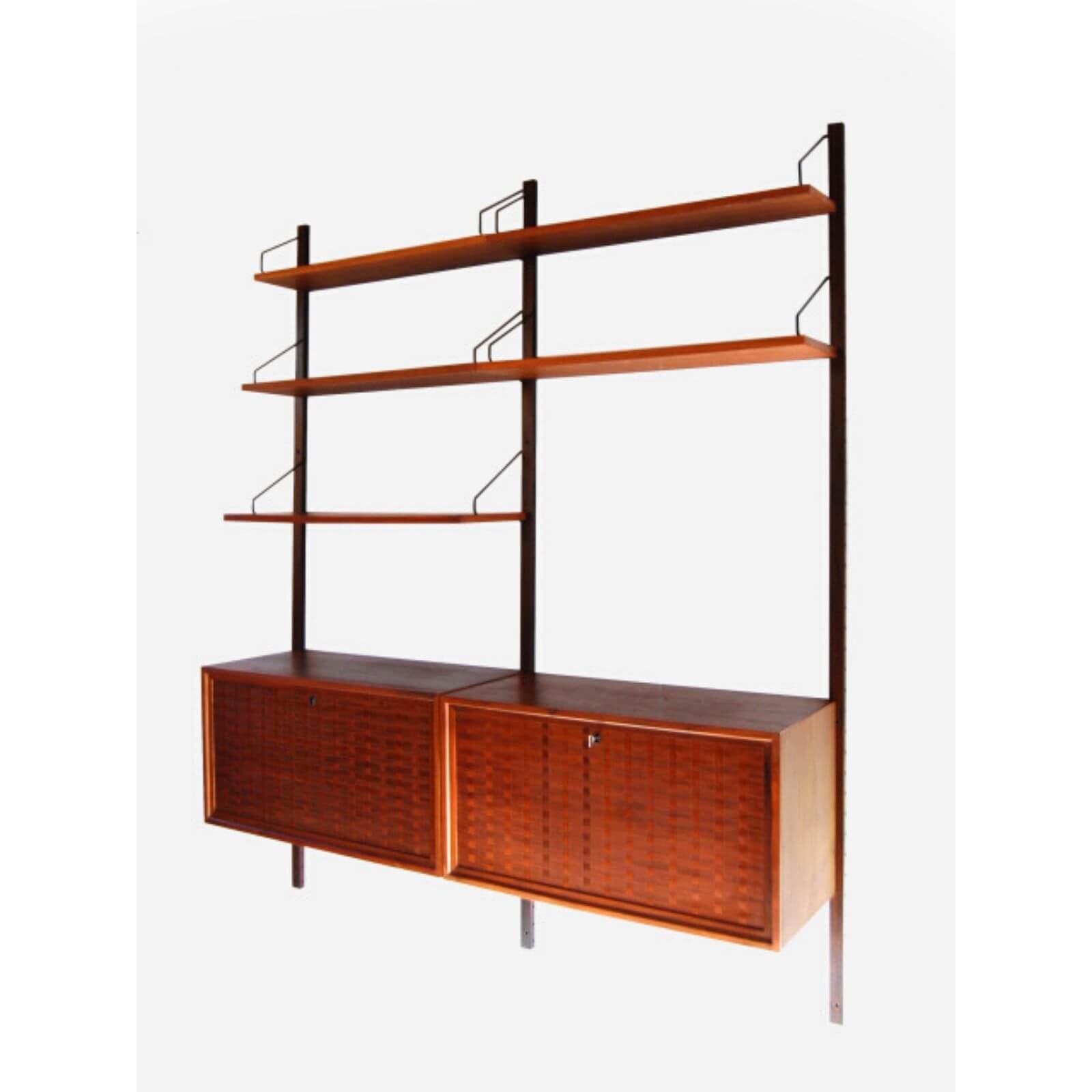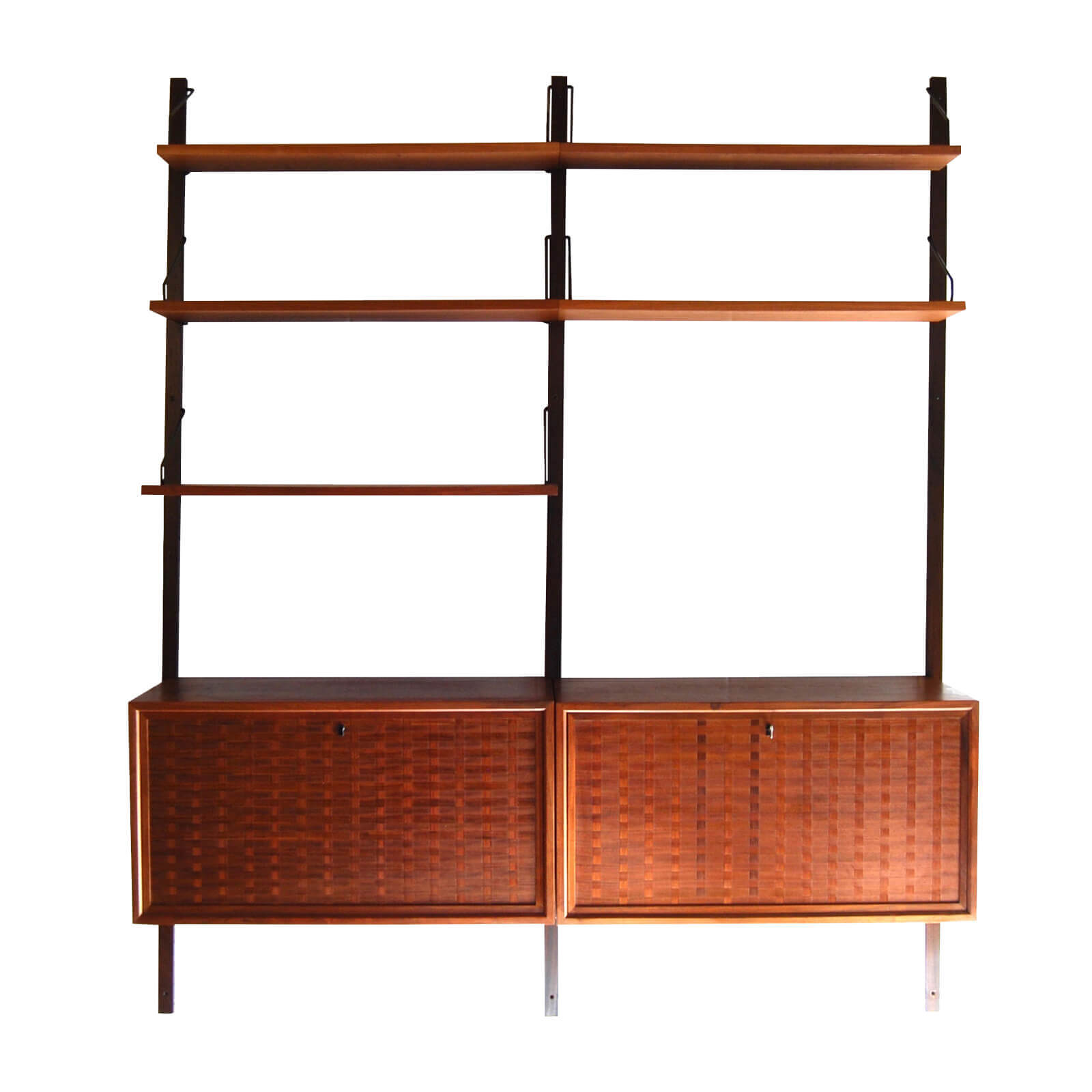 Poul Cadovius walnut wall unit. Born in Copenhagen in 1911, Cadovius originally trained as a saddler and upholsterer. He was a colourful and successful designer with a marked influence on the Danish furniture industry and furniture design. Despite being among the first Danish furniture designers to work with plastics, Cadovius is best remembered for his primed wood shelving units known as the Royal Shelving System which was a huge success throughout the 50s, 60s and 70s. On offer is this modular two bay wall unit which is both versatile and functional as it can be arranged in any configuration you like. Featuring interesting basket weave fronts on the two cabinets, four different depth shelves and black hardware. Light wear and surface scratches throughout. Some veneer chipping at the back edges of the cabinets and shelves. Requires assembly directly onto a wall.