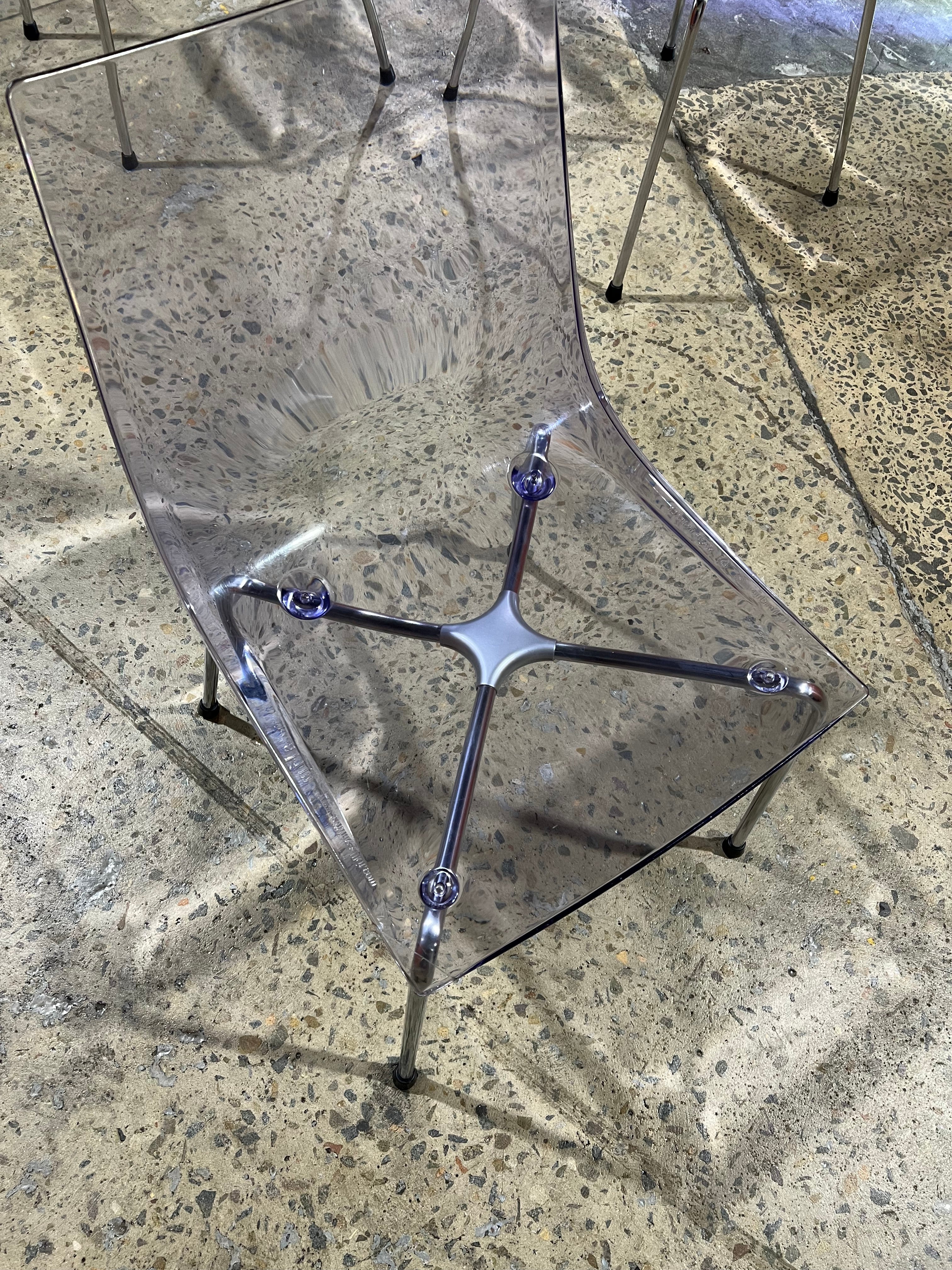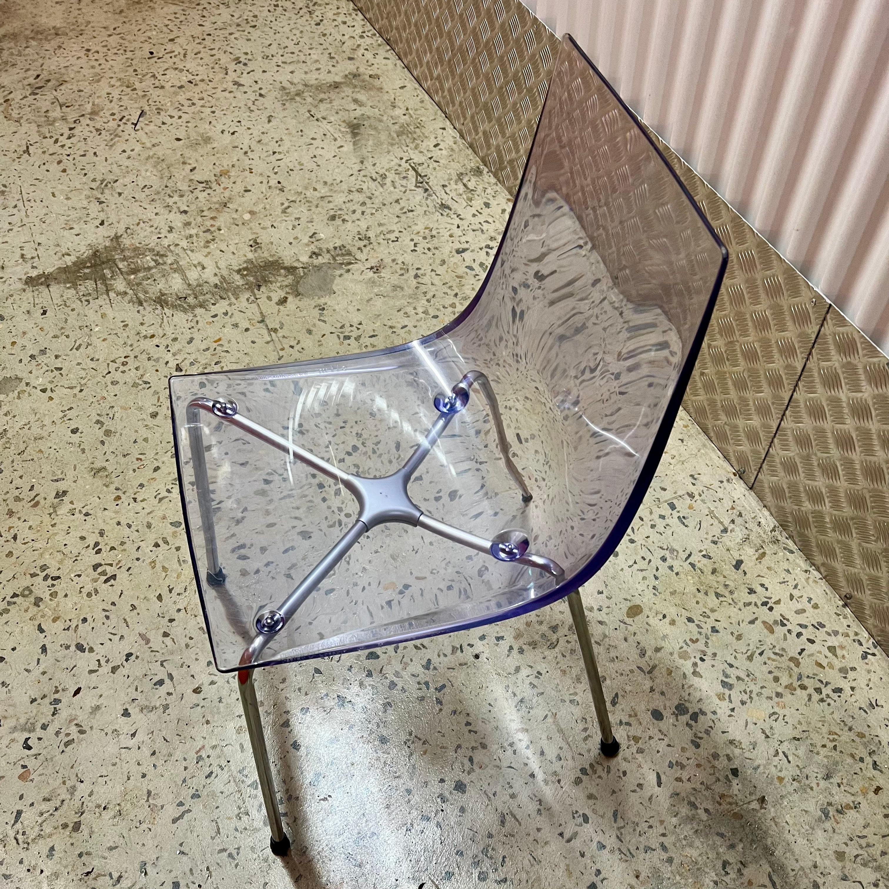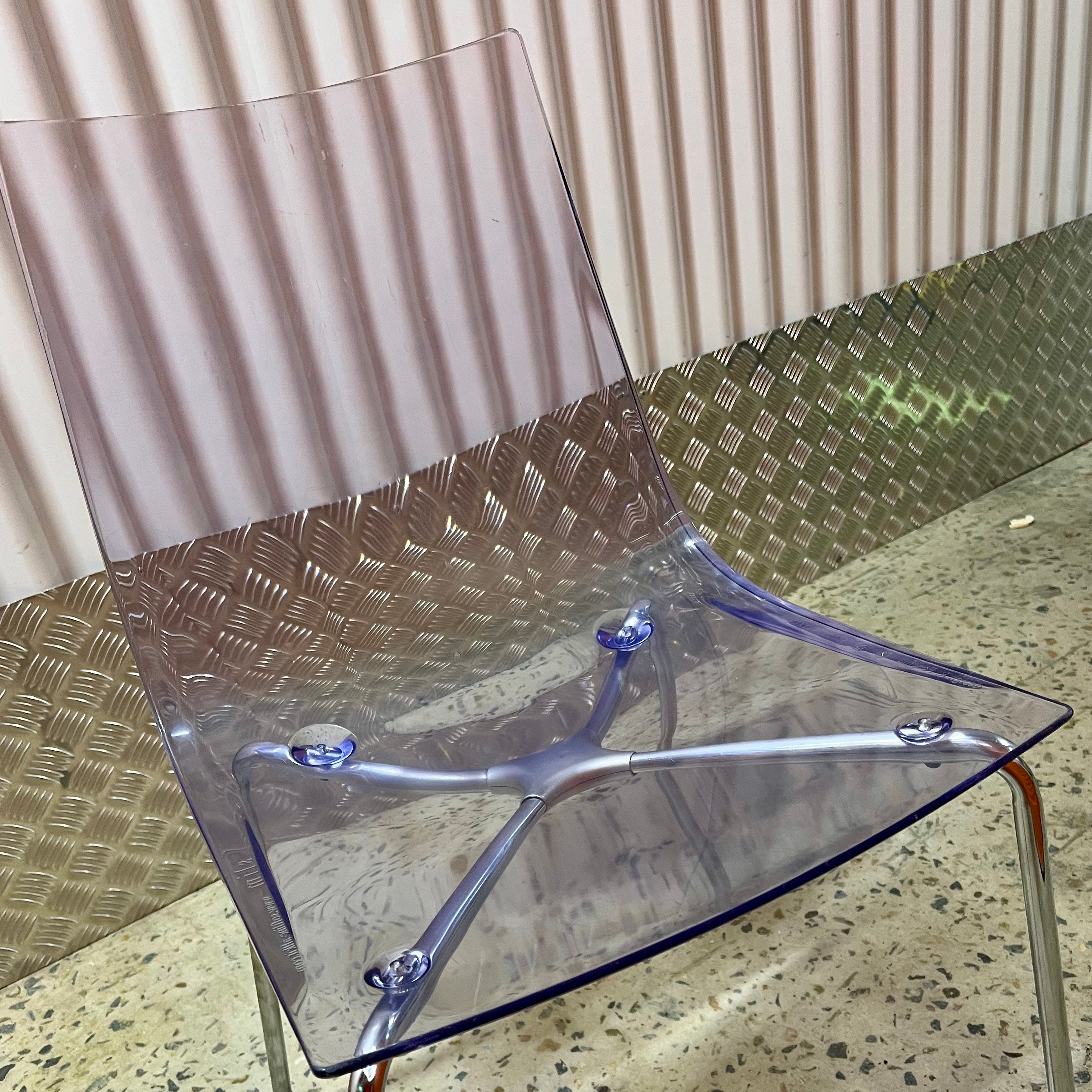 Roberto Foschia Slim Softline All Kit Chairs. Eight slim chairs in blue-tinted acrylic and polished metal frame. Designed by Roberto Foschia for Softline Allkit, Italy. This set of eight showcases the designer’s signature minimalist aesthetic with a contemporary twist. Featuring a sleek silhouette and soft, ergonomic contours, each chair is finished in a subtle blue tint that adds a touch of sophistication to any dining space. Crafted for both comfort and style, these chairs embody Foschia’s commitment to functional elegance. One chair has had a chip on the corner that has been repaired so that the structural integrity is not compromised. Note these chairs can be purchased in sets of 2 at a price of $300 per chair.