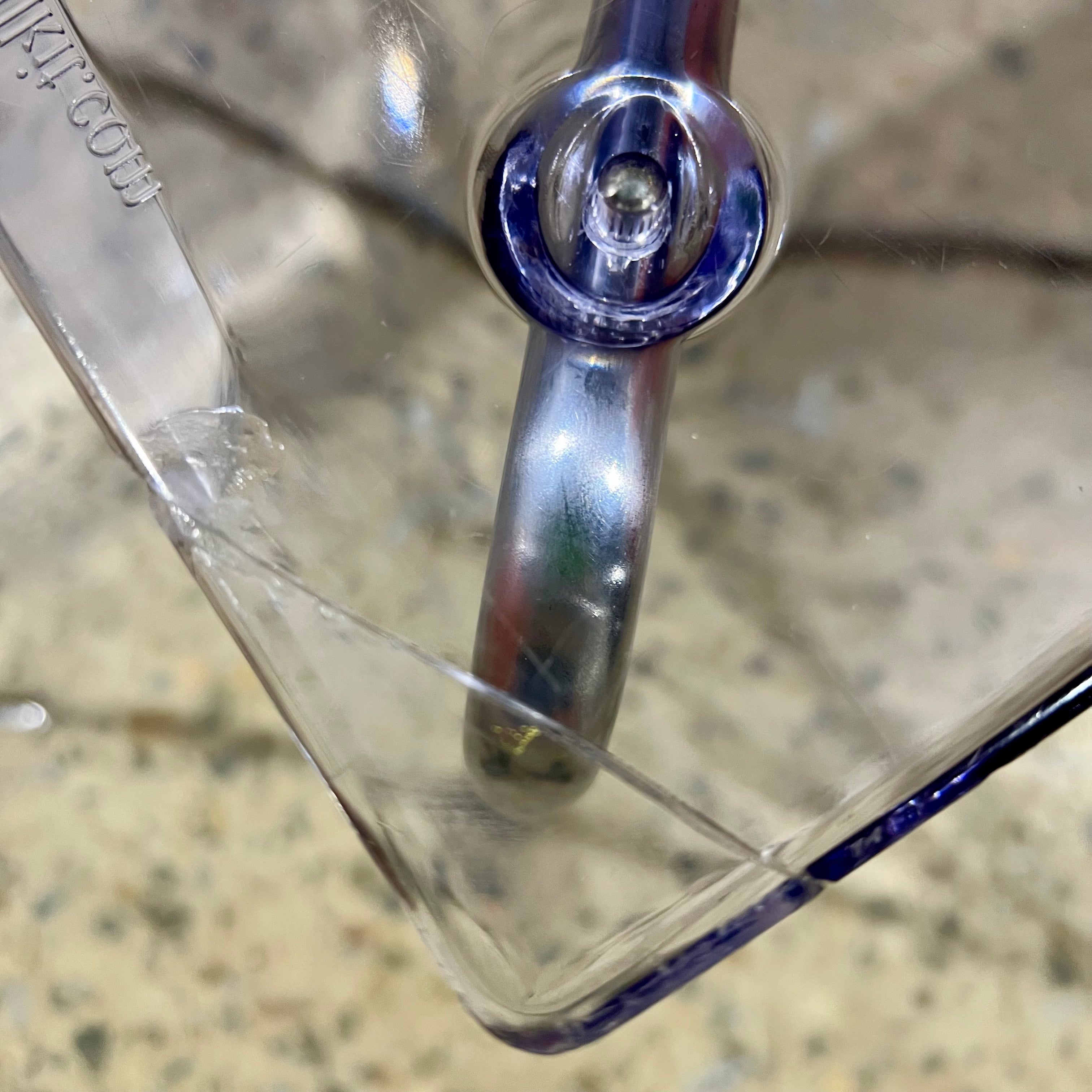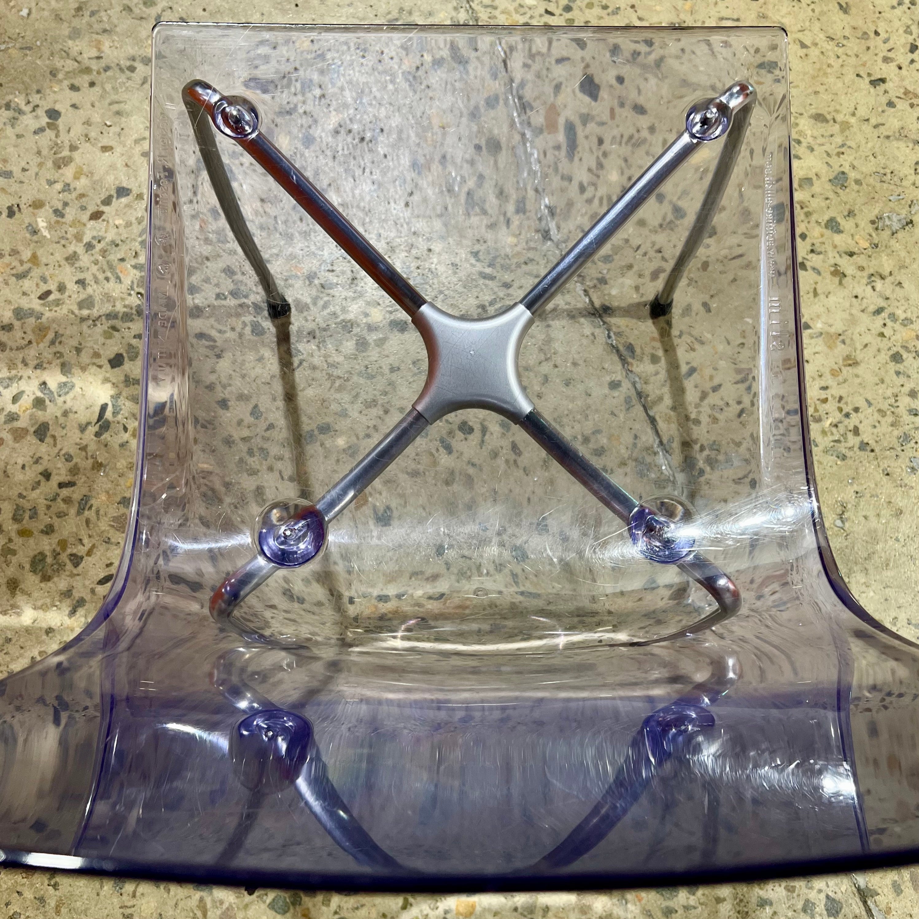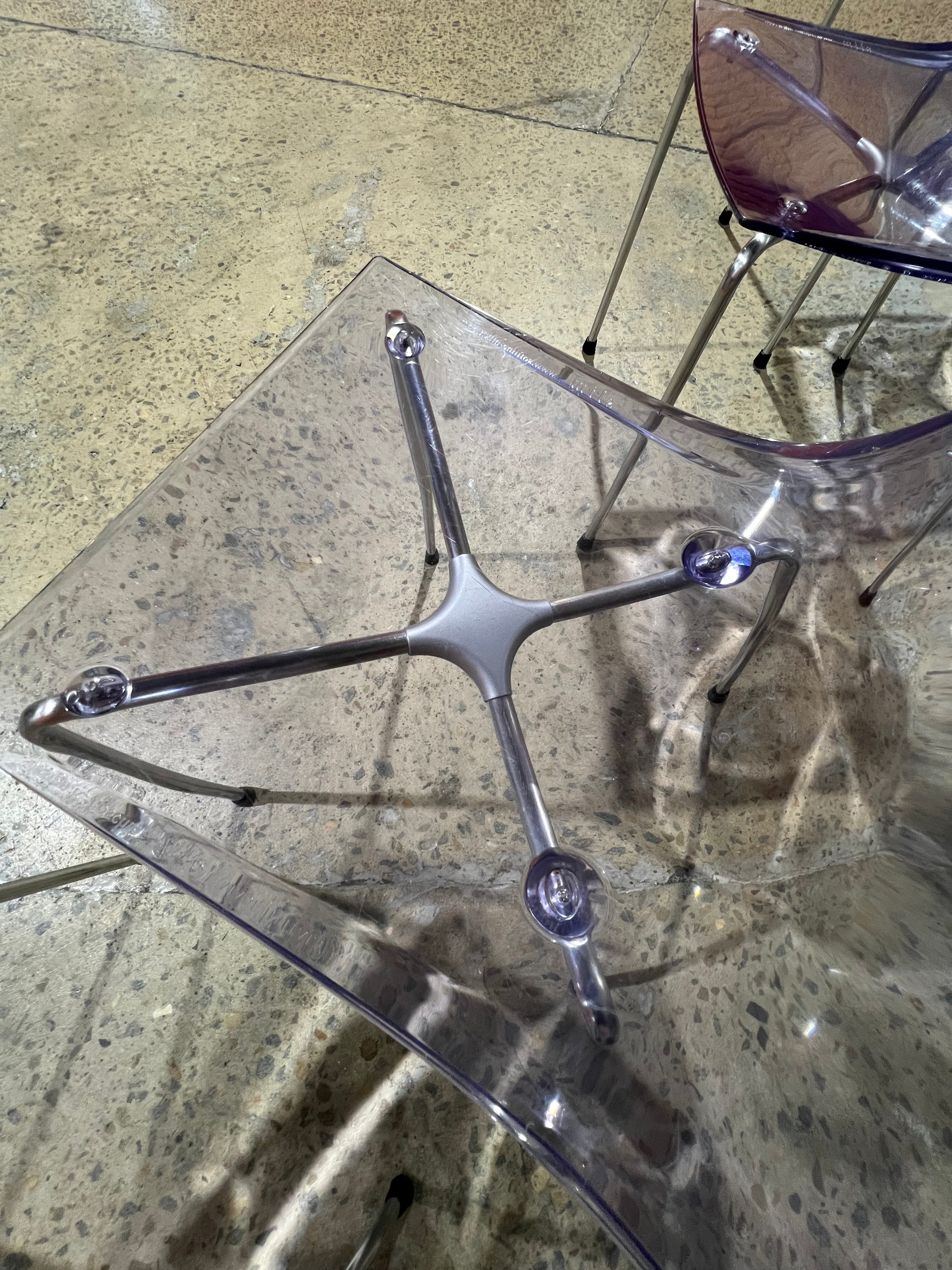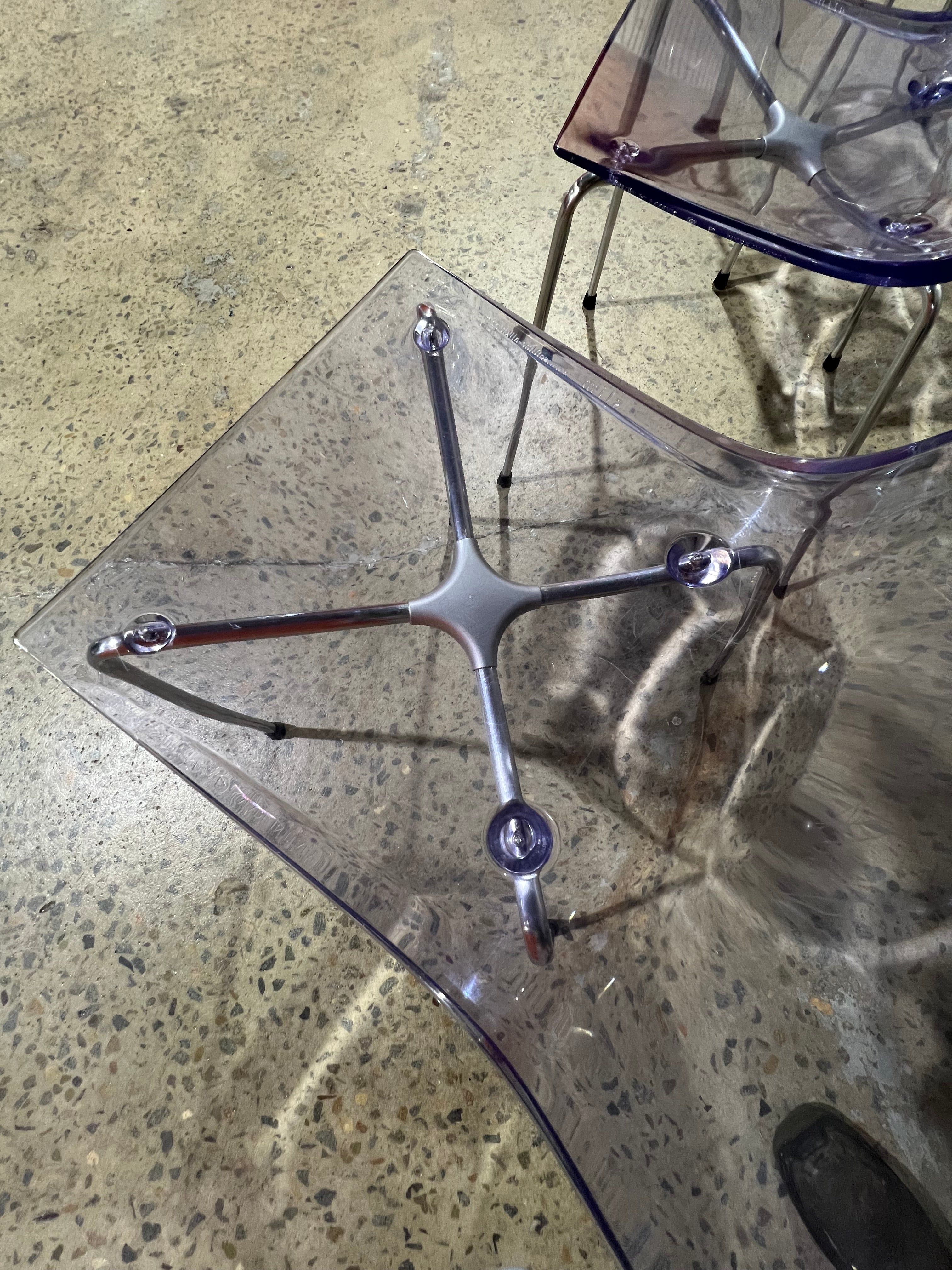 Roberto Foschia Slim Softline All Kit Chairs. Eight slim chairs in blue-tinted acrylic and polished metal frame. Designed by Roberto Foschia for Softline Allkit, Italy. This set of eight showcases the designer’s signature minimalist aesthetic with a contemporary twist. Featuring a sleek silhouette and soft, ergonomic contours, each chair is finished in a subtle blue tint that adds a touch of sophistication to any dining space. Crafted for both comfort and style, these chairs embody Foschia’s commitment to functional elegance. One chair has had a chip on the corner that has been repaired so that the structural integrity is not compromised. Note these chairs can be purchased in sets of 2 at a price of $300 per chair.