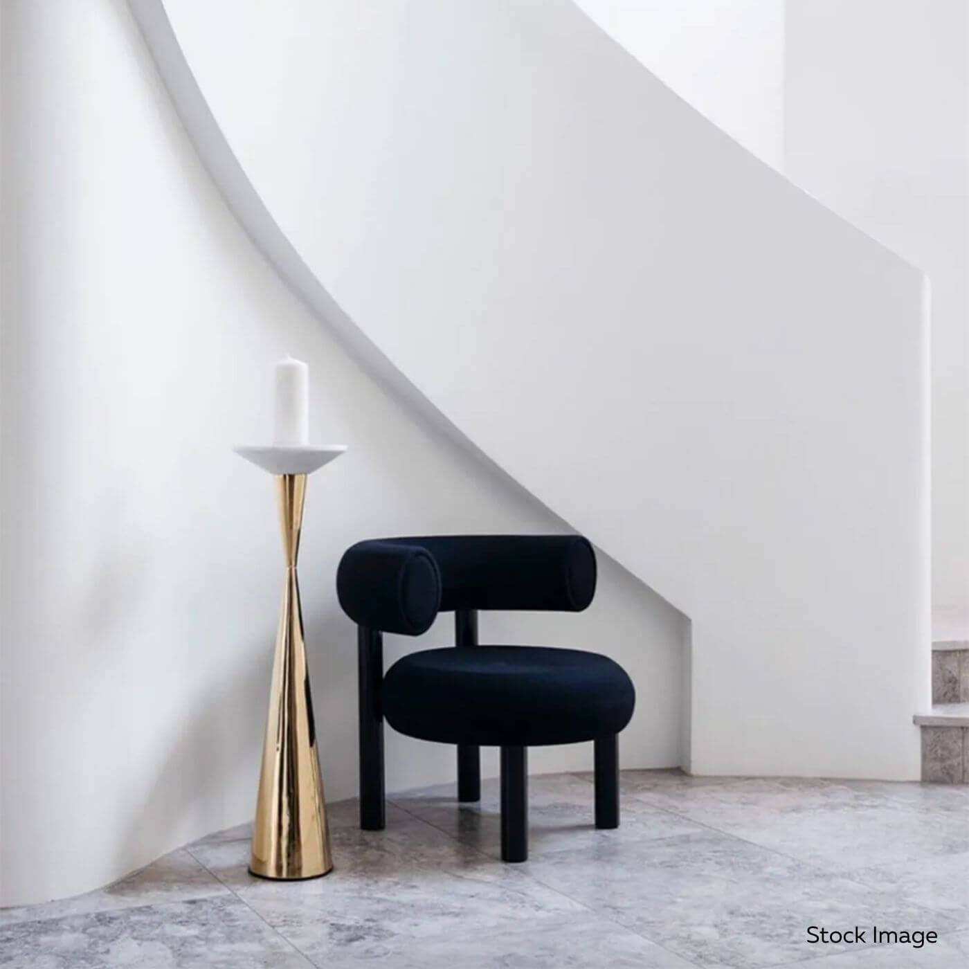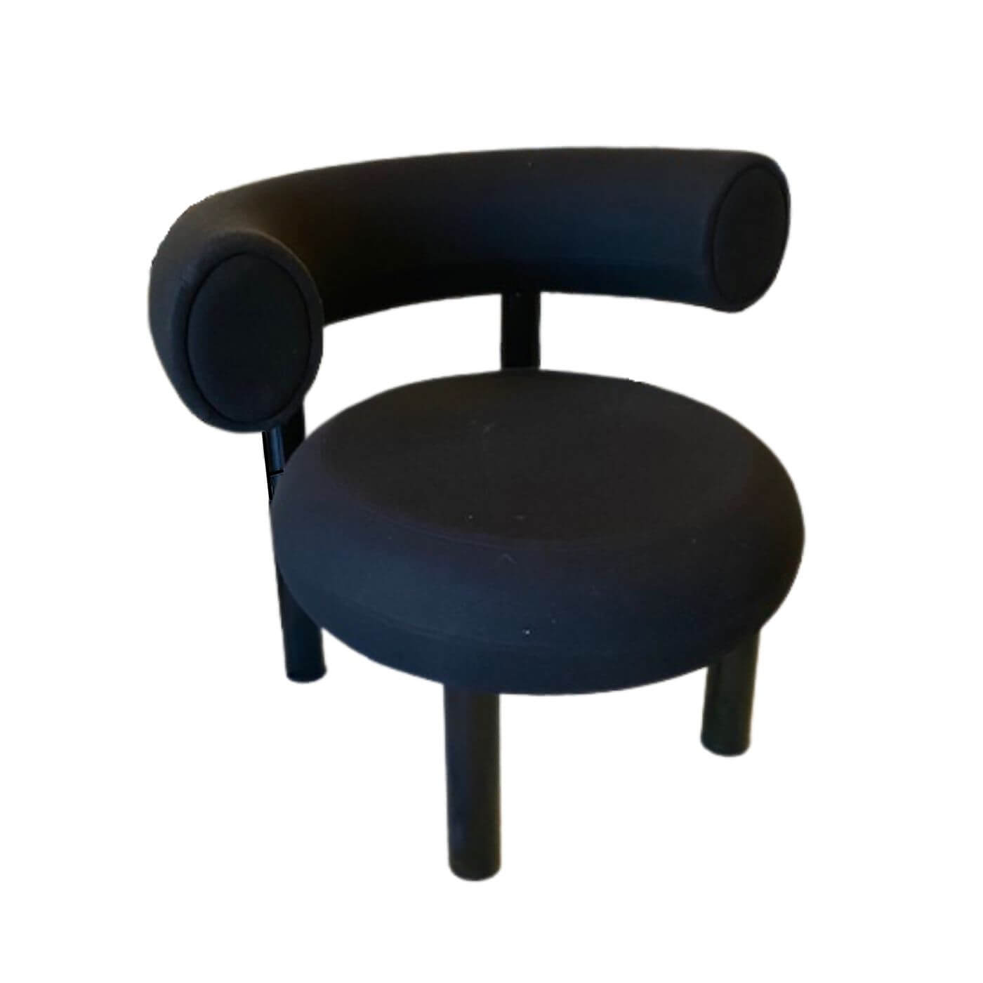 Tom Dixon Fat Lounge Chair with black fabric seat and high gloss black legs, two available. The chair marries form and function by comfortably hugging the body with moulded foam seat and backrest. The humorous silhouette is eye catching and instantly adds a design element to any space. Perfect as an accent chair or as a chair for lounging. Purchased at Top 3 by Design in 2020 and in very good condition. Recommended retail price $2,790.