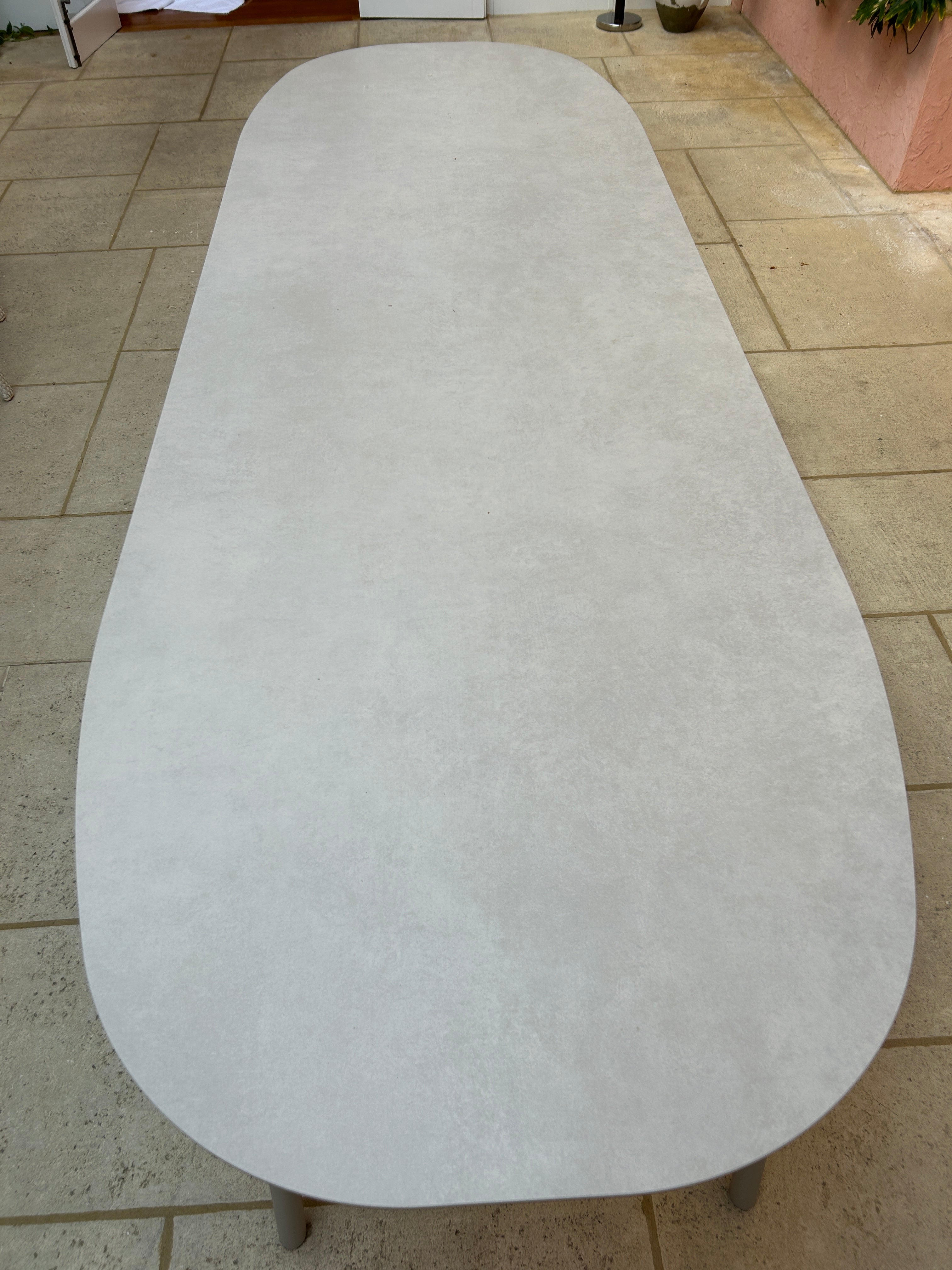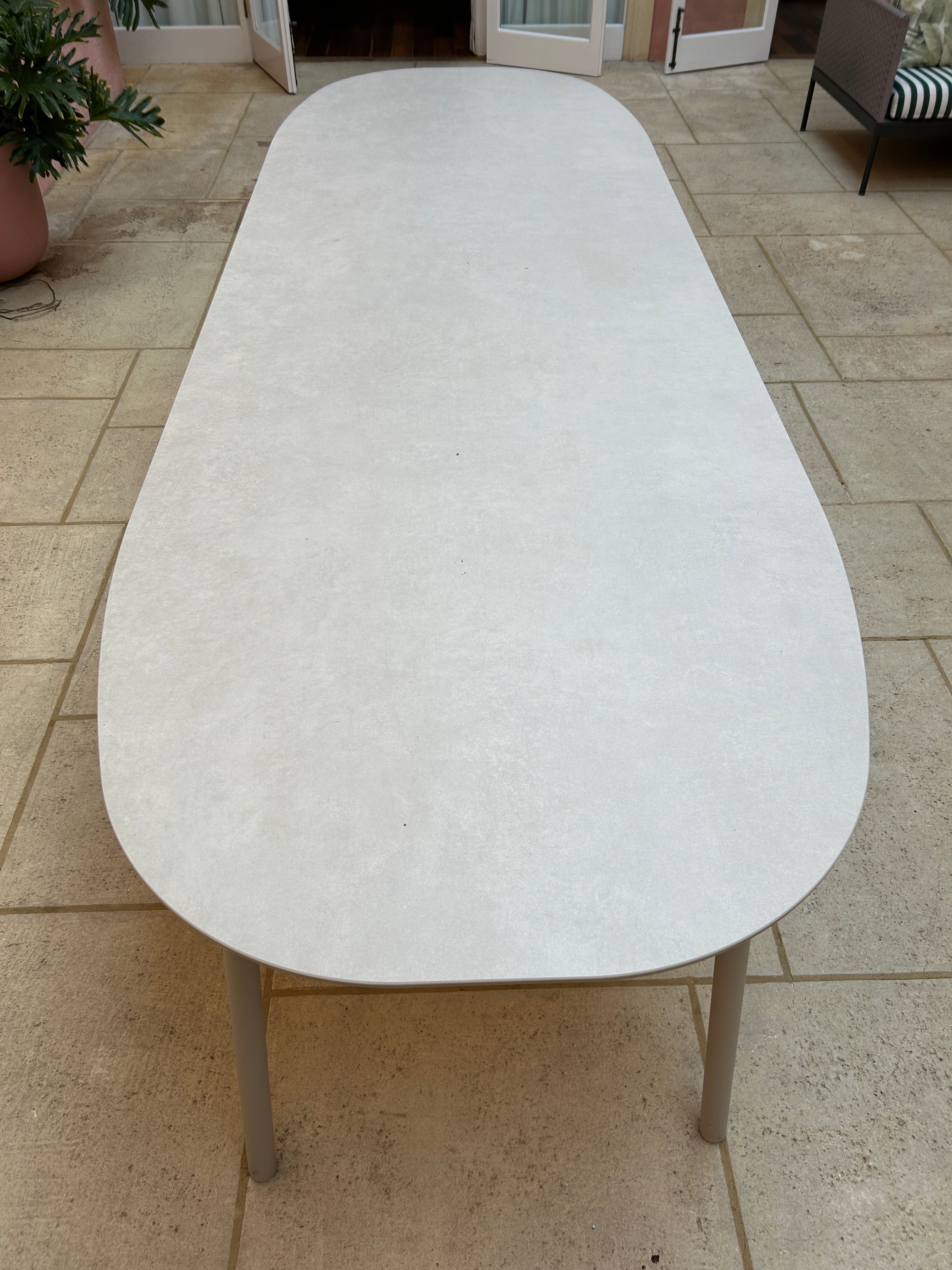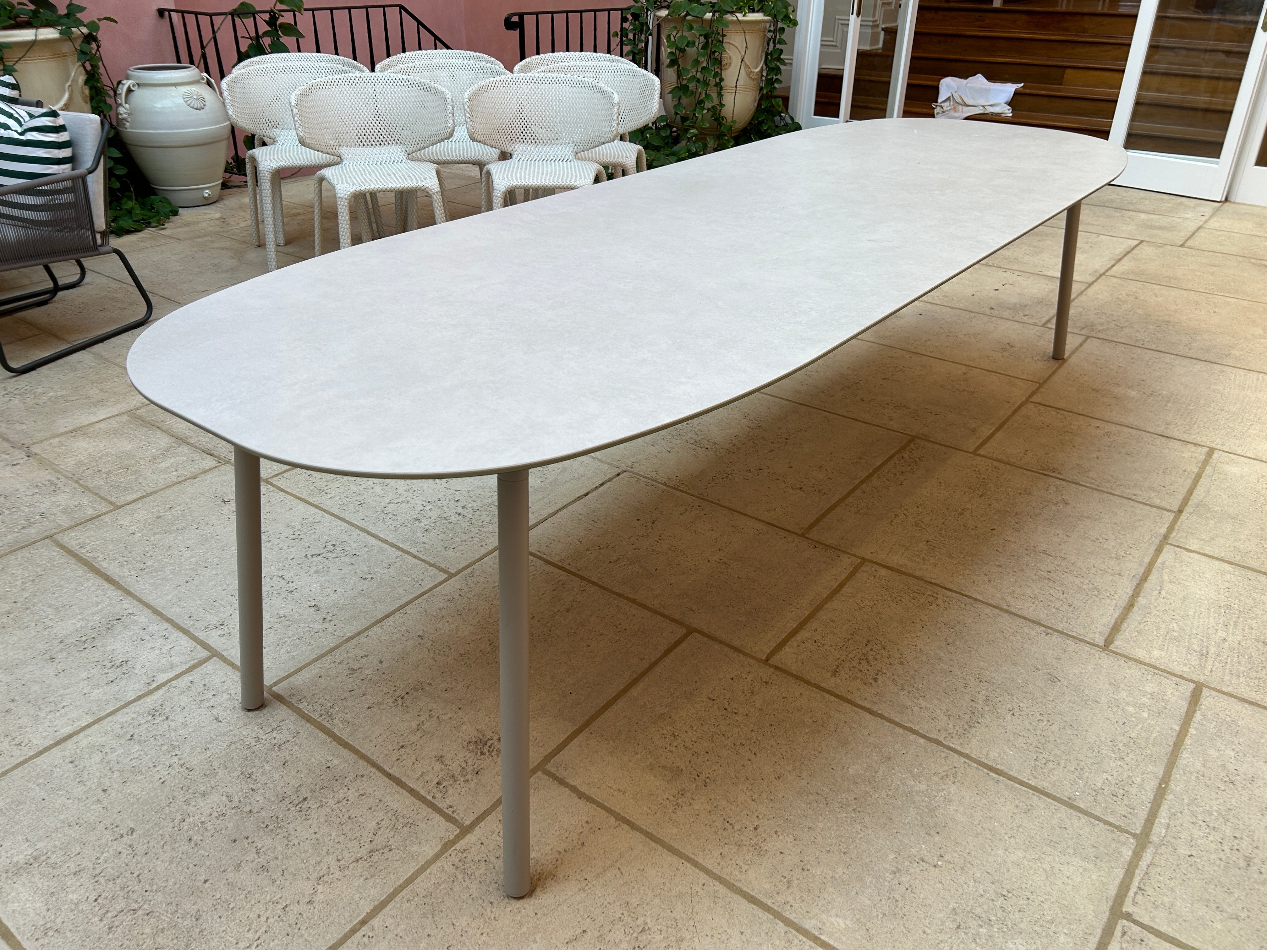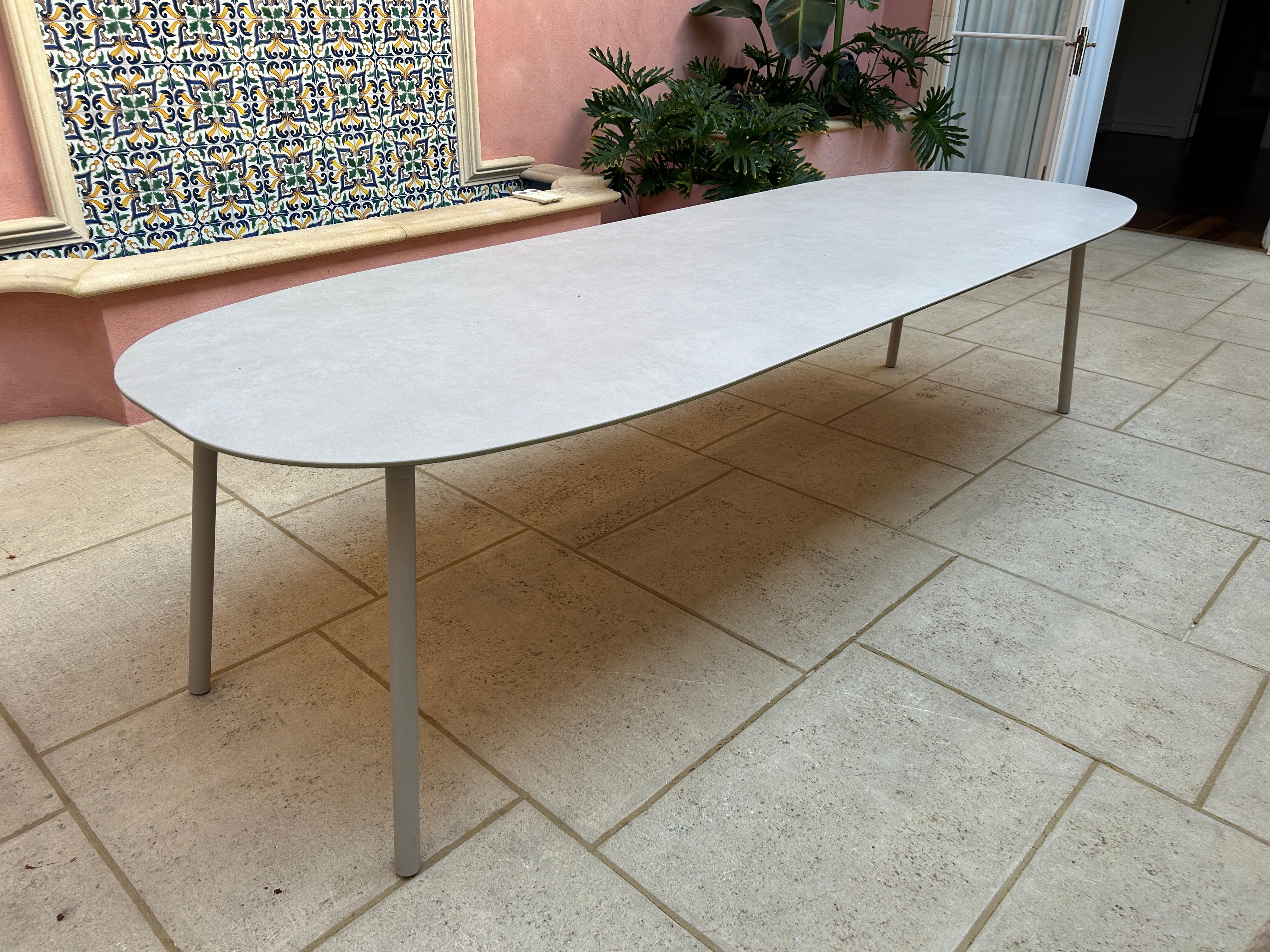 Seating 10 the Tosca Outdoor table by Tribu is a sleek, sophisticated design. The ceramic tabletop in a beautiful oval shape has a very natural look and feel, echoing the effect of natural stone, while being non-porous for easy everyday use. Frame in powder coated 304 Stainless Steel with an outdoor ceramic top. We purchased this table in 2021 and have very rarely used it. It has been sitting in a fully enclosed courtyard, so no wear & tear from the elements. No scratches anywhere - it is like new. Chairs sold separately.