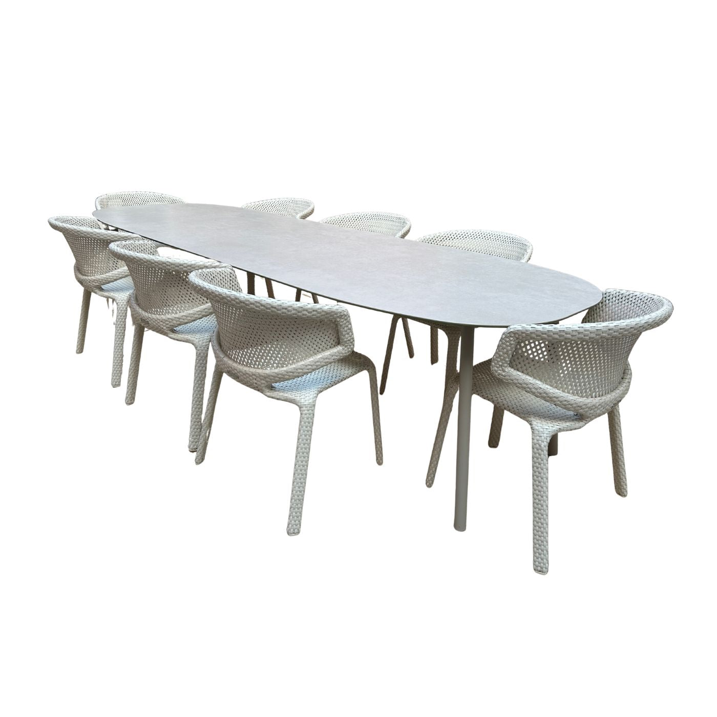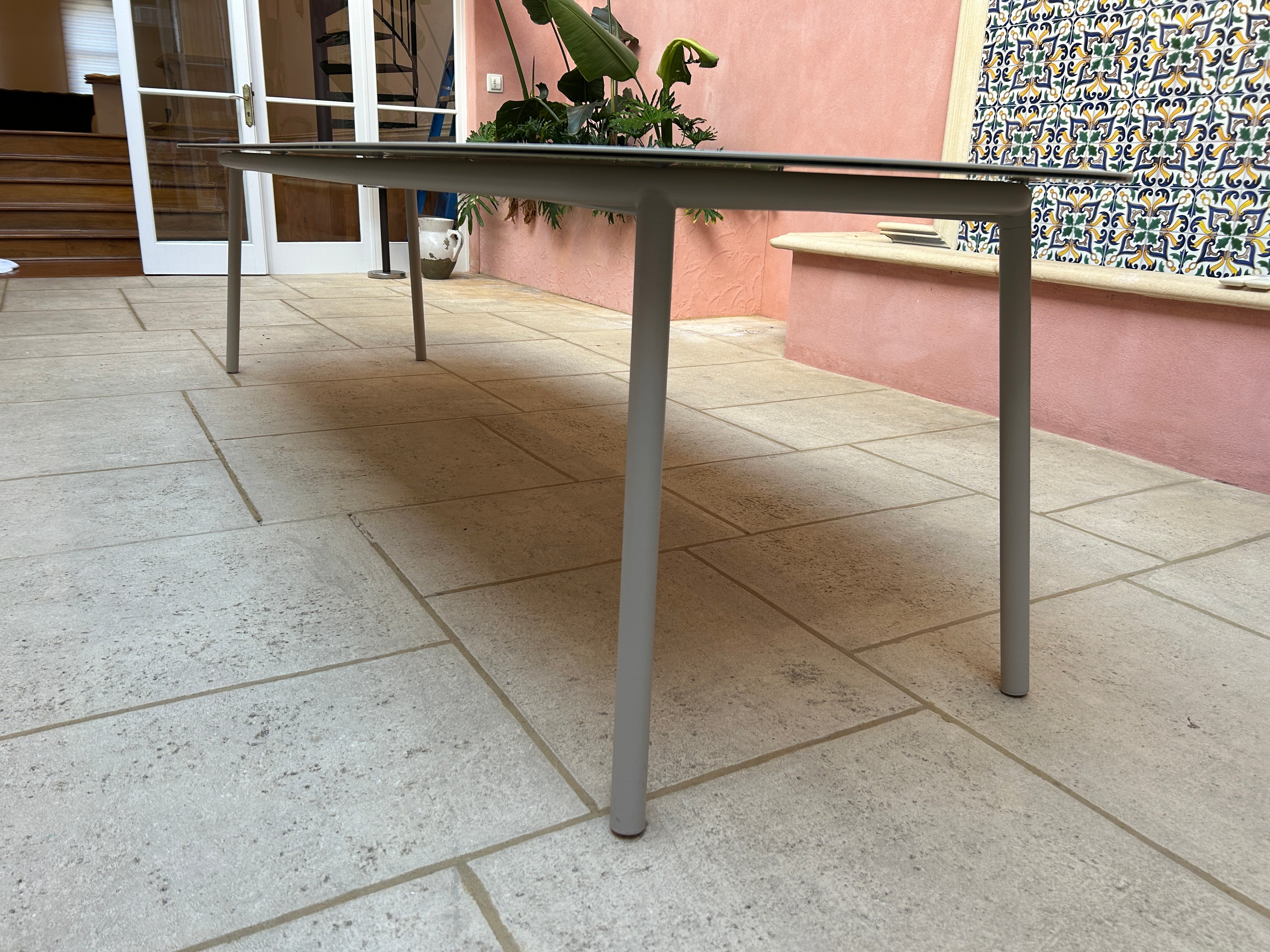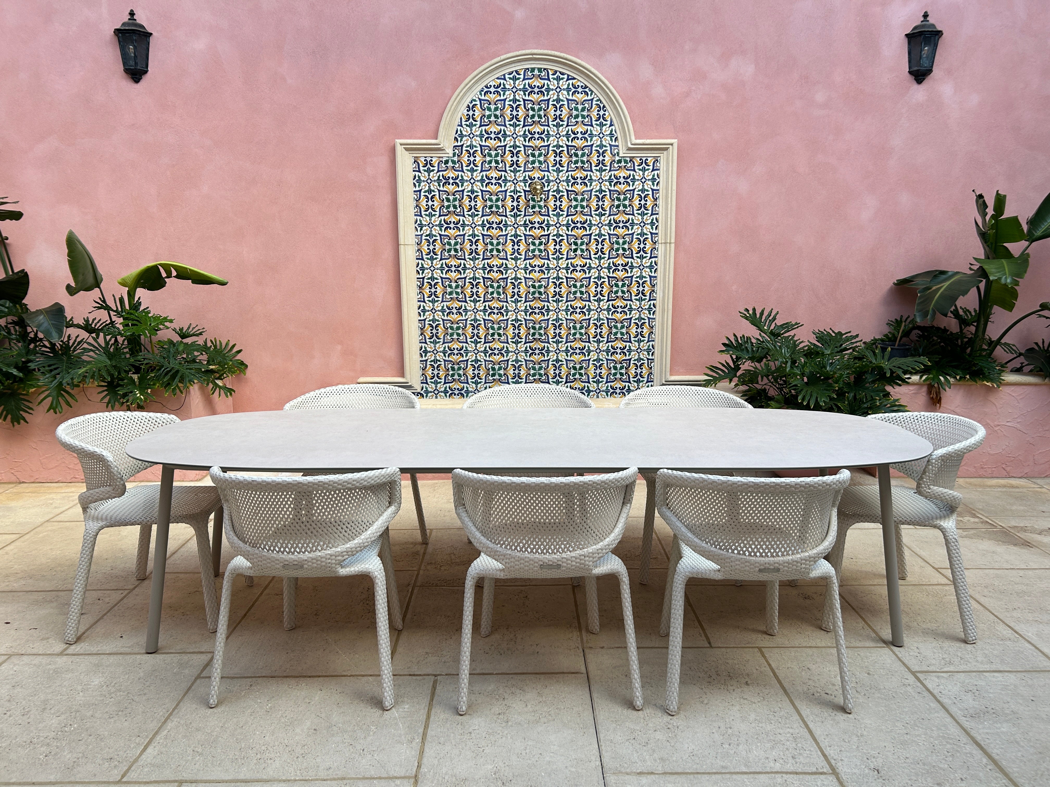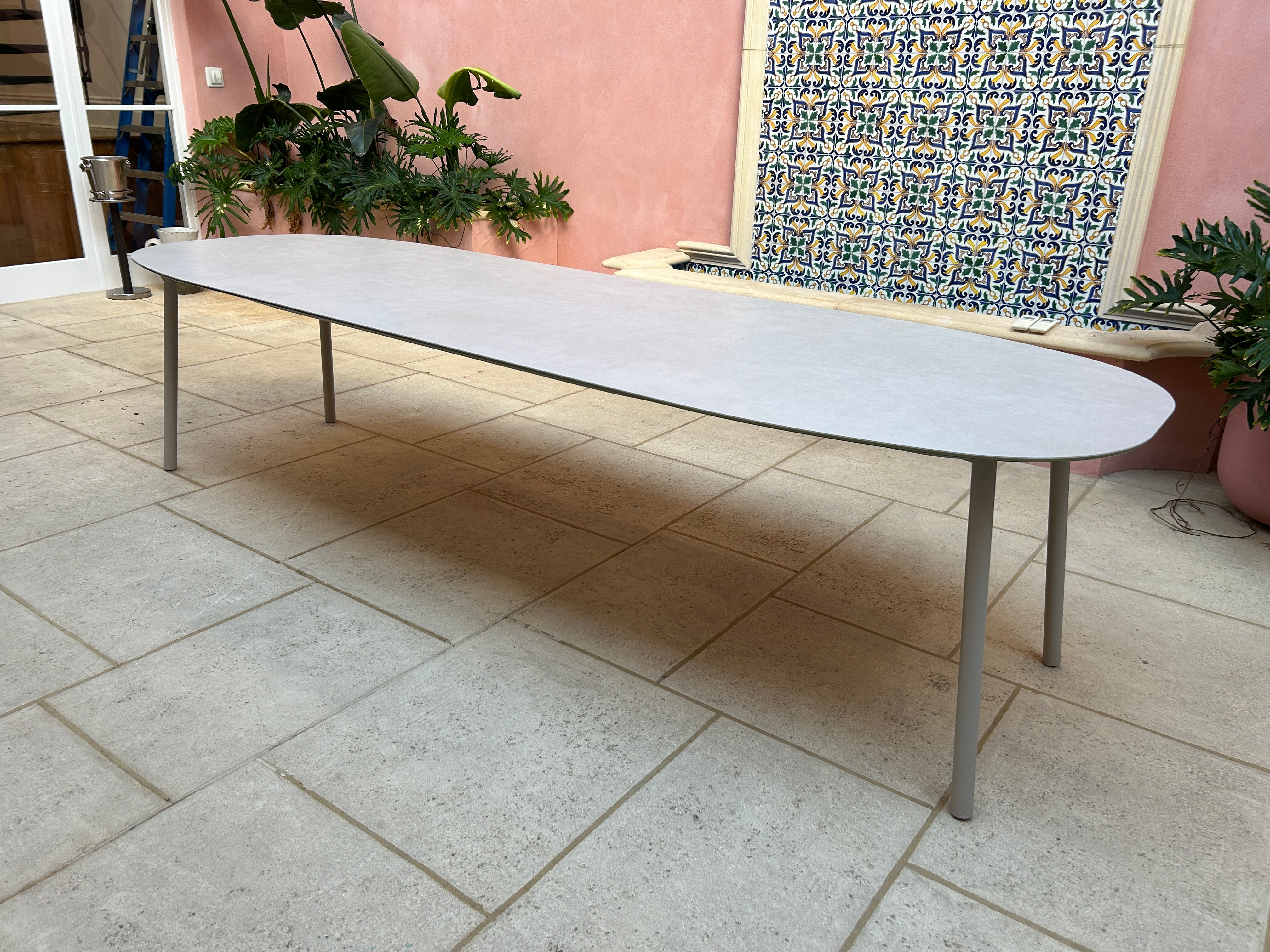 Seating 10 the Tosca Outdoor table by Tribu is a sleek, sophisticated design. The ceramic tabletop in a beautiful oval shape has a very natural look and feel, echoing the effect of natural stone, while being non-porous for easy everyday use. Frame in powder coated 304 Stainless Steel with an outdoor ceramic top. We purchased this table in 2021 and have very rarely used it. It has been sitting in a fully enclosed courtyard, so no wear & tear from the elements. No scratches anywhere - it is like new. Chairs sold separately.