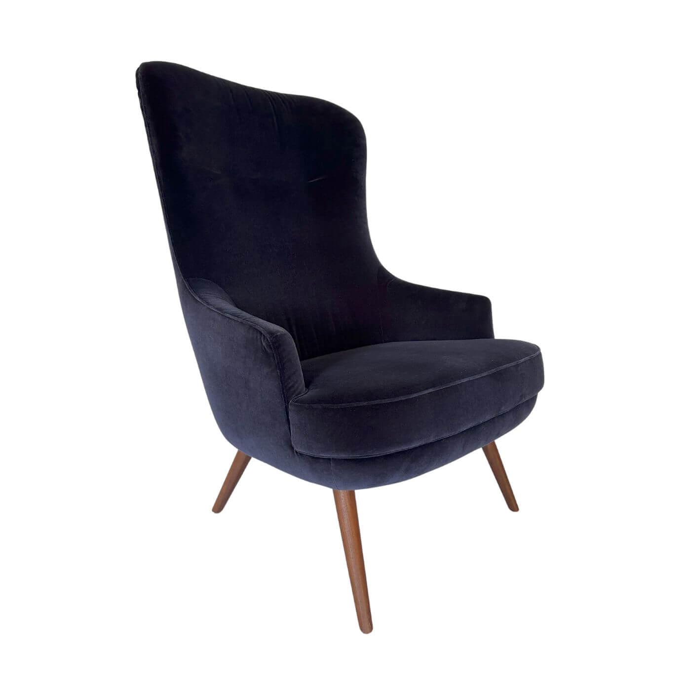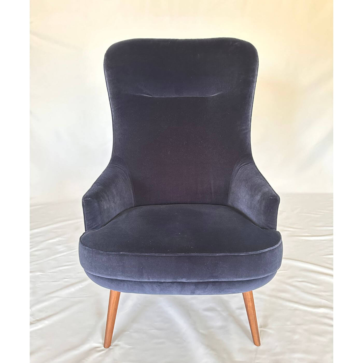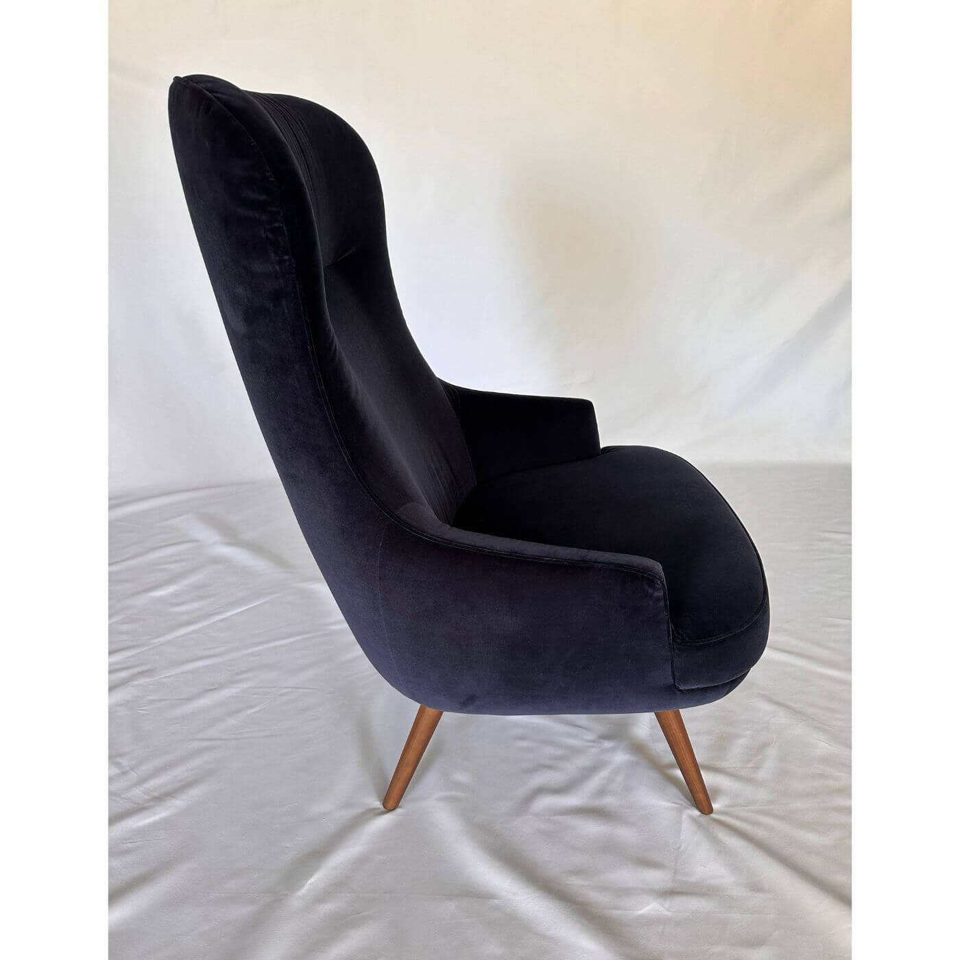 Walter Knoll 375 Relaxchair model 377-10 high back. Upholstered in sumptuous Harald Ocean 792 velvet, which has a beautiful soft misty blue hue. Nutwood stain 4-legged base. The comfortable Relaxchair is reminiscent of an elegant mid-century armchair. The perfect cocoon and haven for relaxing, reading, chatting, and thinking. At home in places of retreat like living rooms and libraries or a corner of the bedroom. Recommended retail price $6,760)