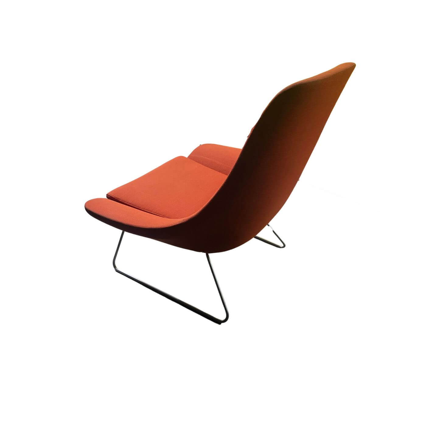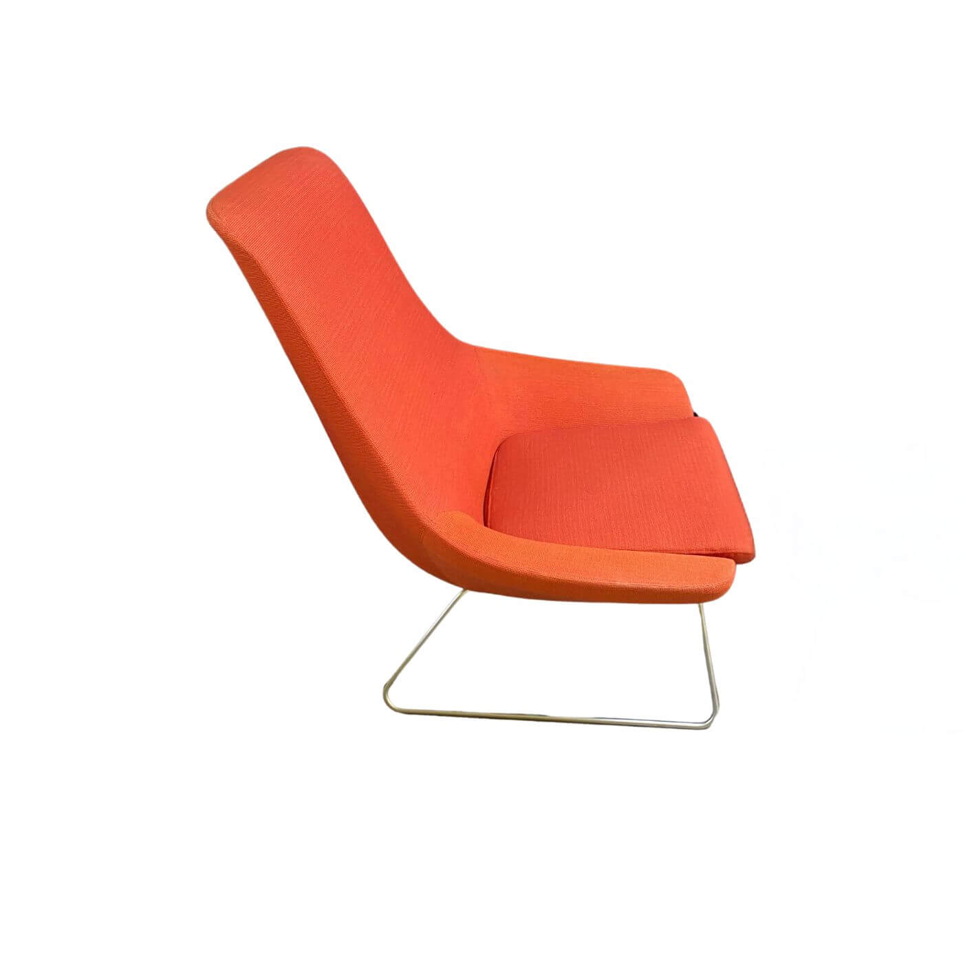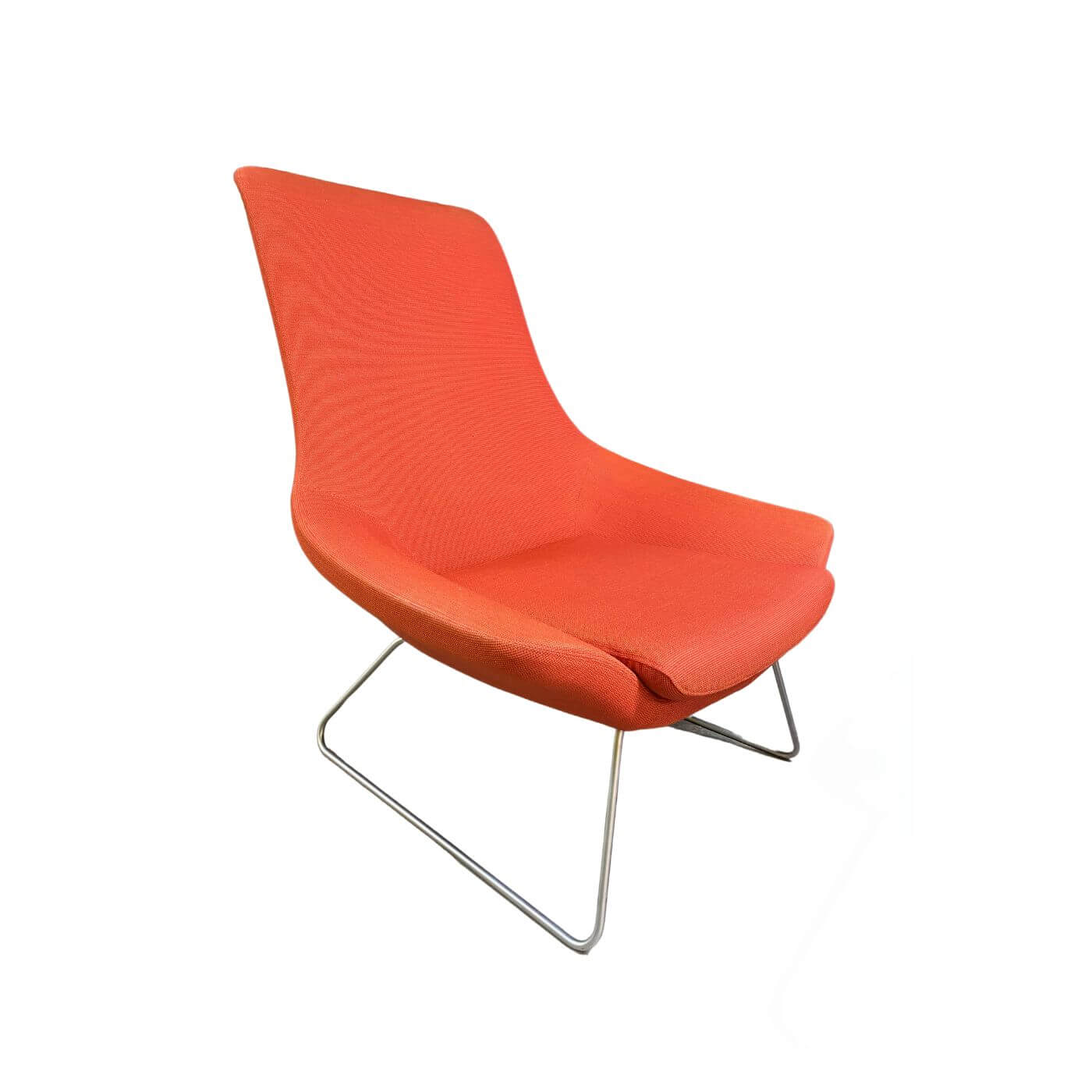 The Flow Chair by Tom Lloyd and Luke Pearson was designed in 2002 and manufactured by Walter Knoll. This chair is in ‘very good’ secondhand condition and upholstered in orange fabric on a tubular brushed steel sled base. The moulded bucket seat features a high back and is curved to create integrated back and armrests.