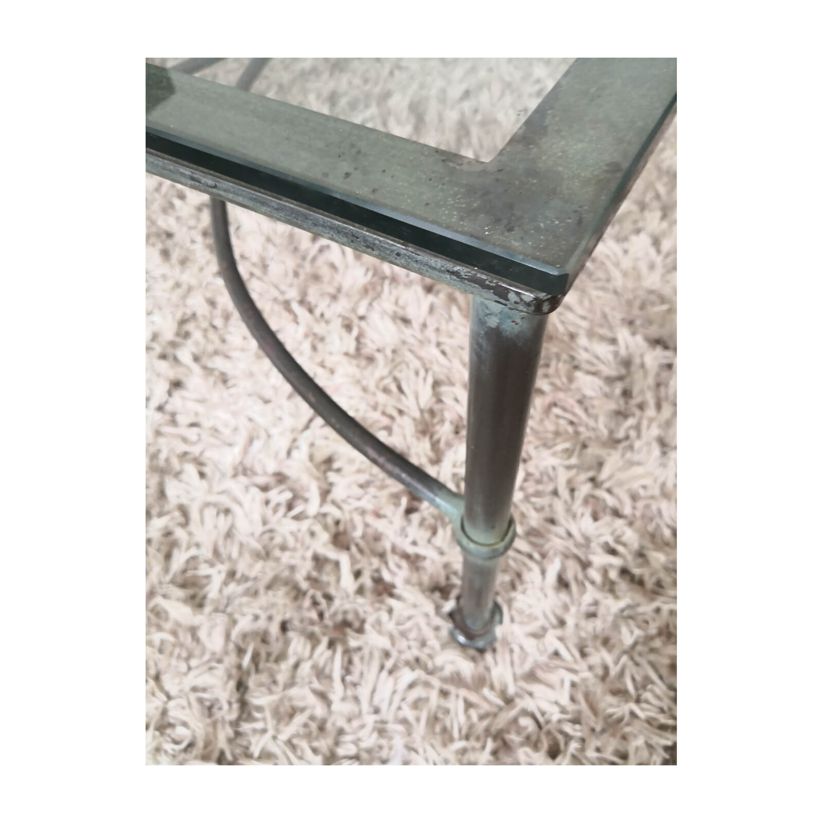 Wrought iron coffee table with glass top. A lovely metal base table with traditional details that allow it to sit comfortably in traditional or contemporary settings. Green tinged iron detailing. Frame in excellent condition. Some minor surface imperfections in glass.